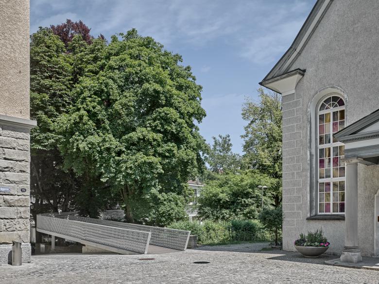 Der Wiboradaweg ist der Brückenschlag von der historischen Altstadt zur Universität St. Gallen. Er führt aus der Altstadt St. Gallens elegant entlang der Bäume des St. Mangen Parks über den Unteren Graben, durch den neuen Erschliessungskern des Parkhauses bis ins Universitätsquartier. Der intime Charakter der Parkanlage von 1952 mit der zentralen offenen Wiese und die Wirkung der Kirche St. Mangen werden in Essenz erhalten. Unser Bestreben, die fragile Balance des denkmalwürdigen Ensembles zu schützen, wird durch die filigrane Konstruktion, die Materialisierung und die schlanken Stützen umgesetzt. Auf der Höhe der Brücke entstehen neue interessante Blickbezüge zum Querschiff der Kirche und zur Umgebung.