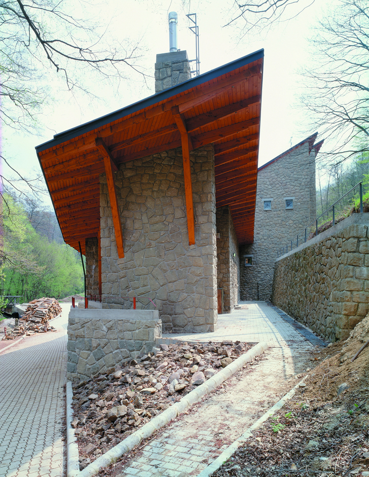 “The space-system of the building fits to the steep mountain slope step by step in such a way that one can get out from almost all levels of the house to the surrounding site. The whole building with its corridors, rising parapets and abstract, painting-like world of color opens up in the space of the main staircase. The mass of the building moves according to functional needs, while the permanent pitch-angle of the roof, the stonework and the homogeneity of the titanzink-roof represents unity. The architectural language of the forest school, its details independent form any kind of fashion reach timeless expressions. This work is one of the most well-done piece of contemporary Hungarian architecture.”