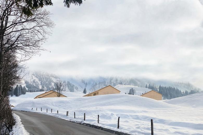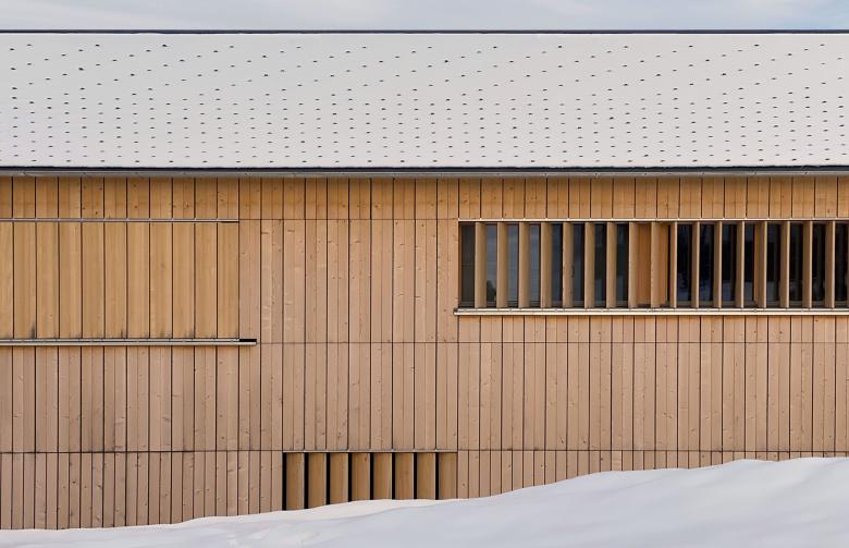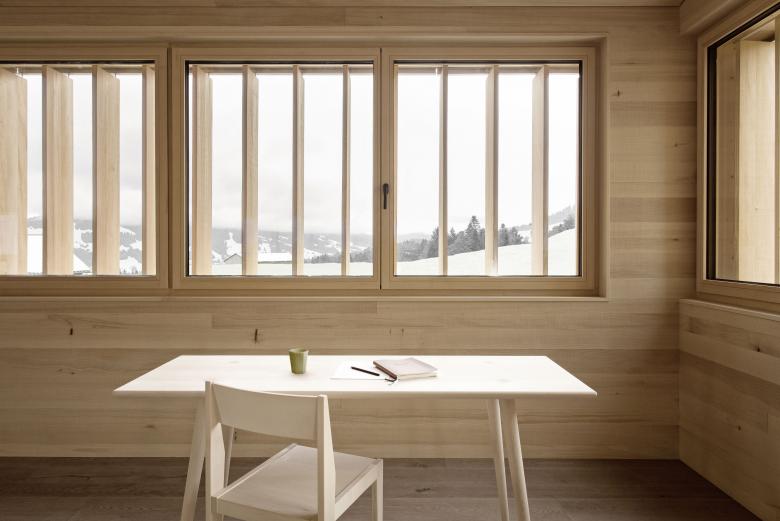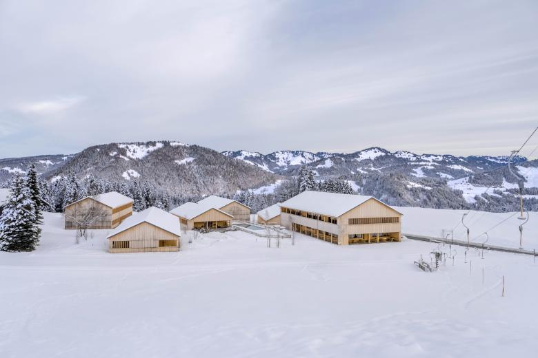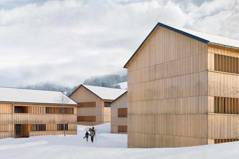Zur Architektur: In 15 Minuten gelangt man von Egg, dem zentralen Ort im Bregenzerwald, über die Gemeindestraße nach Schetteregg auf 1.060 m Seehöhe. Hier liegt die Fuchsegg Eco Lodge. Nach der Grundsatzentscheidung, das Raumprogramm in einzelne Häuser zu gliedern, entwickelten wir die Rolle der einzelnen Häuser und die kompletten Grundrisse aller Häuser, also auch das Konzept für Gastronomie, Seminarbereiche, Bibliothek und Saunahaus. Die äußere Anmutung war uns ein besonderes Anliegen. Die Häuser sollten mit einer gelassenen Selbstverständlichkeit Teil der Landschaft werden, deshalb entwarfen wir ein Fassadensystem in Holz, das die Baukörper einheitlich in den Ort „hineinaltern“ lässt. Ein Highlight sind sicherlich die Fensterbänder mit den drehbaren Holzlamellen, die sich über alle Gebäude hinwegziehen und der ganzen Häusergruppe Konsequenz und Ruhe verleihen.