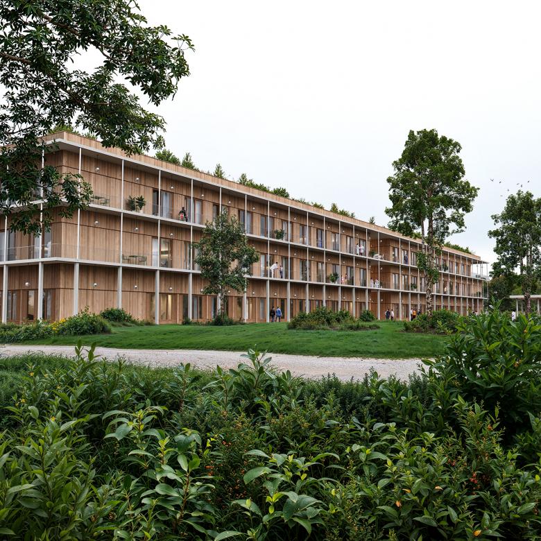 Die Stationen sind einheitlich gestaltet, mit lichtdurchfluteten Innenhöfen als Orientierungspunkt. Umlaufende Balkone bieten nicht nur privaten Zugang von jedem Zimmer, sie schaffen auch eine starke Verbindung zum grünen Außenraum. Das vergrößerte Mutter-Kind-Zentrum legt einen besonderen Schwerpunkt auf Neonatologie sowie Kinder- und Jugendmedizin. Hier richtet sich die Gestaltung nach den Bedürfnissen der kleinsten Patient:innen, mit familienfreundlichen Raumkonzepten und einer farbharmonischen Innenausstattung. Eine Besonderheit des Neubaus ist die Unterbringung der gesamten Technik in den Untergeschossen, mit direkter Anbindung an die OP-Säle im Erdgeschoss. Das Dach ist flächendeckend mit Photovoltaik ausgestattet, wobei die gewonnene Energie dem gesamten Gesundheitscampus zugute kommt.