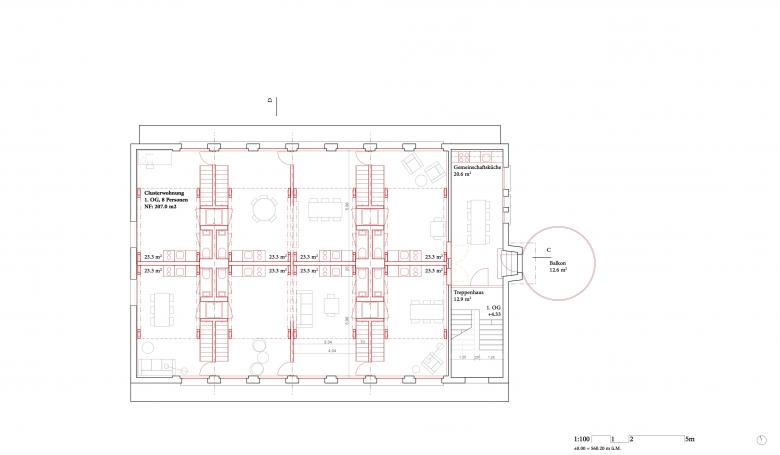 Somit bleibt nicht nur die Bausubstanz sondern vor allem auch die Bedeutung des Gebäudes für den Ort erhalten. Gleichzeitig wird im Anschluss an die Kaserne der Platz frei für einen, auf die Bedürfnisse der Genossenschafter*innen perfekt abgestimmten Neubau. Seine Struktur bietet die nötige Flexibilität, um darin die mannigfaltigen Wohnungsgrundrisse sowie eine Tagesschule im EG zu beherbergen, aber auch auf ändernde Bedürfnisse der Bewohner*innen reagieren zu können.
