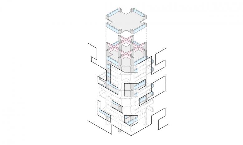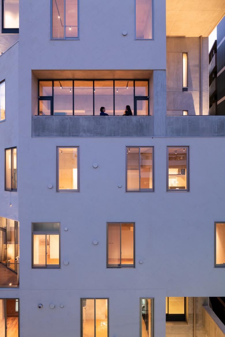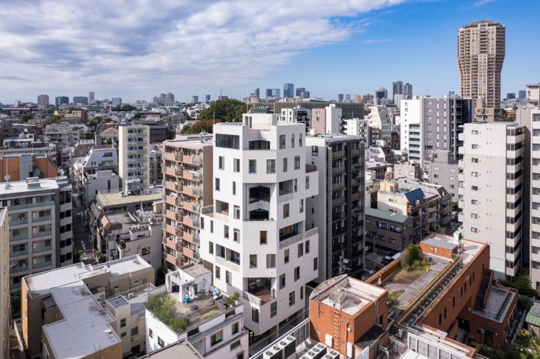The open lattice structure is enveloped by an amorphous outer shell, creating diverse spaces for habitation. Given its location, it's likely to attract many foreign residents. This apartment complex incorporates various urban Japanese landscapes indoors while inherently embracing the diversity of its inhabitants, creating an atmosphere where these elements seem to appear and disappear within the city.