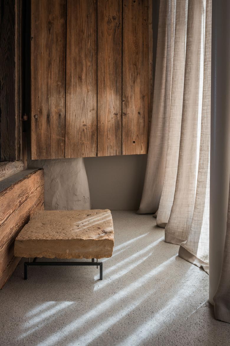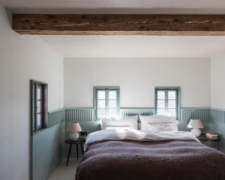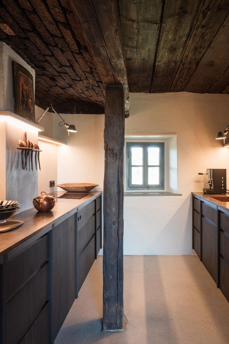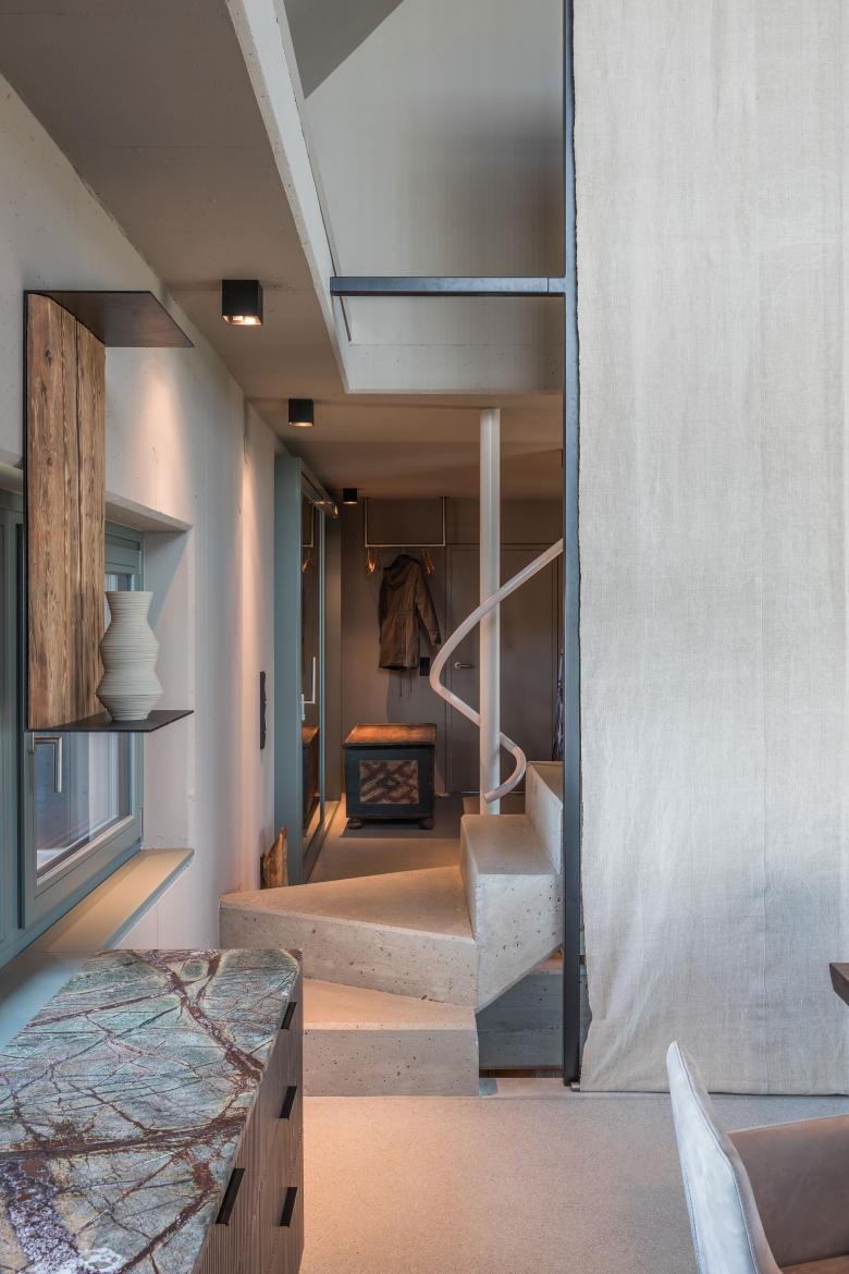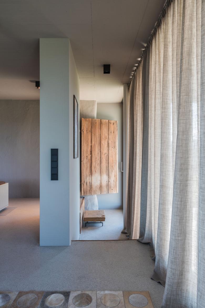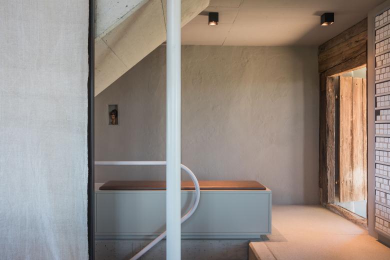 Wir beginnen immer mit einer atmosphärischen Idee, recht unbestimmt, eher ein Gefühl. Kein Weiß, das war klar, eher weiche, gedeckte Farben mit leichten Differenzen als ruhige Grundstimmung. Materialien wie altes Leinen und Holz bringen erste Texturen und schaffen Verbindungen. Die Konzentration auf räumliche Aspekte bleibt auch bei unseren Interior-Arbeiten ein zentrales Thema. Räumliche Sequenzen werden mit Farbe und Material herausgearbeitet. Eine Lamperie umschließt im Schlafzimmer das Bett, eine mit Stein belegte Nische dient der Hygiene, eine alte, gewölbte Ziegeldecke klärt die Grundstimmung der Küche. Das Musikmöbel auf der Galerie ist hoch genug, um auf dem Sofa dahinter verborgen zu schlummern. Erst auf den zweiten Blick werden leichte Irritationen sichtbar. Wie funktioniert die Raumgeometrie im Gästebad? Ist das ein Rosa, da am Geländer?