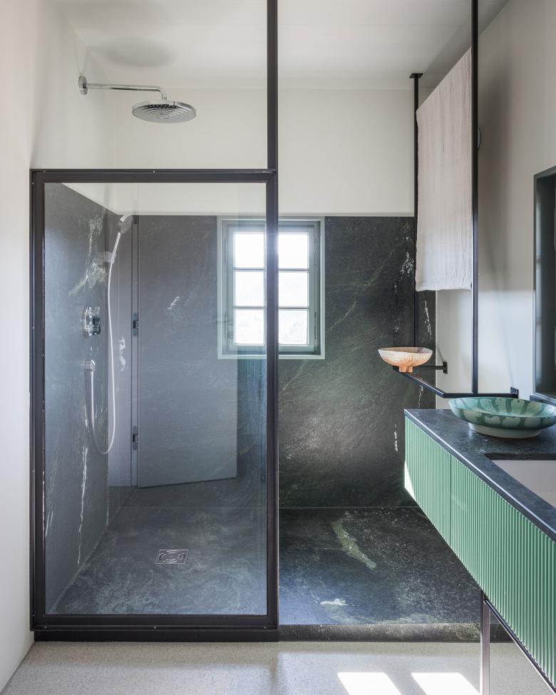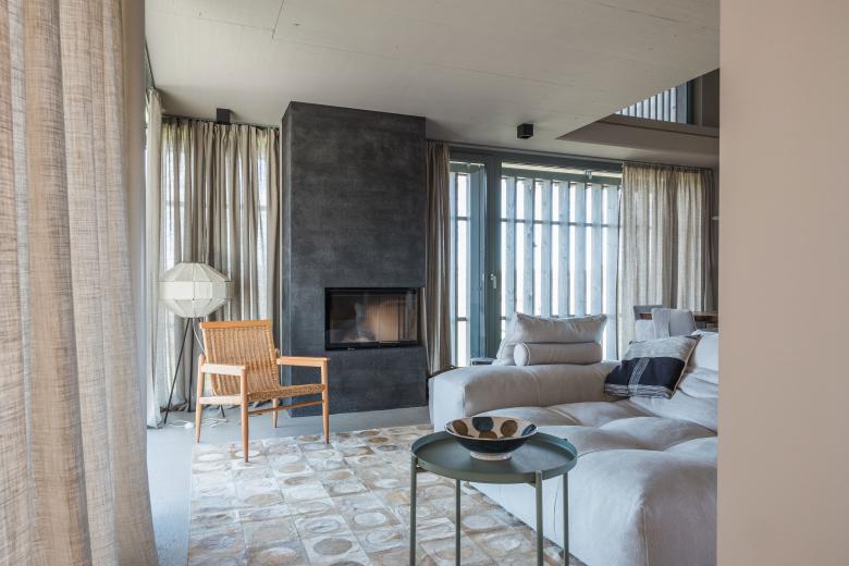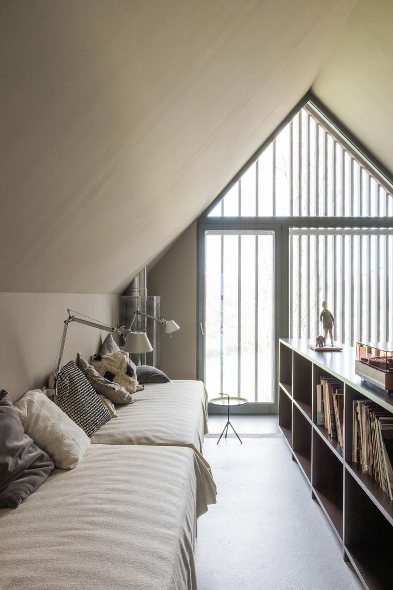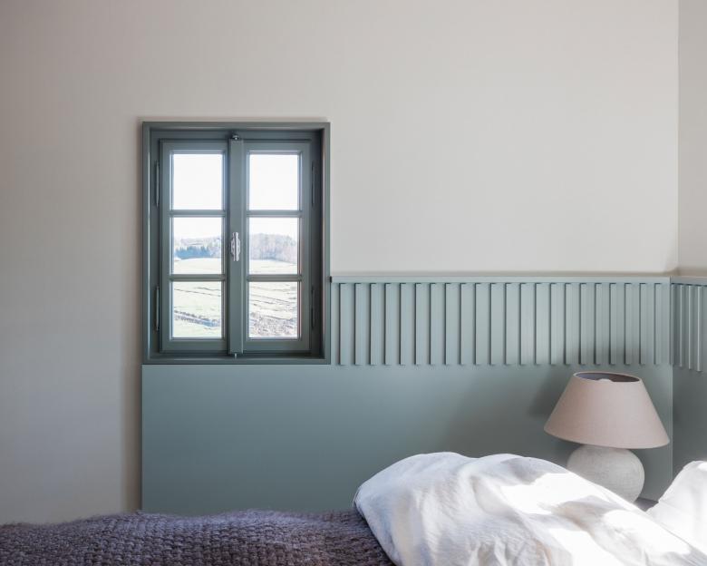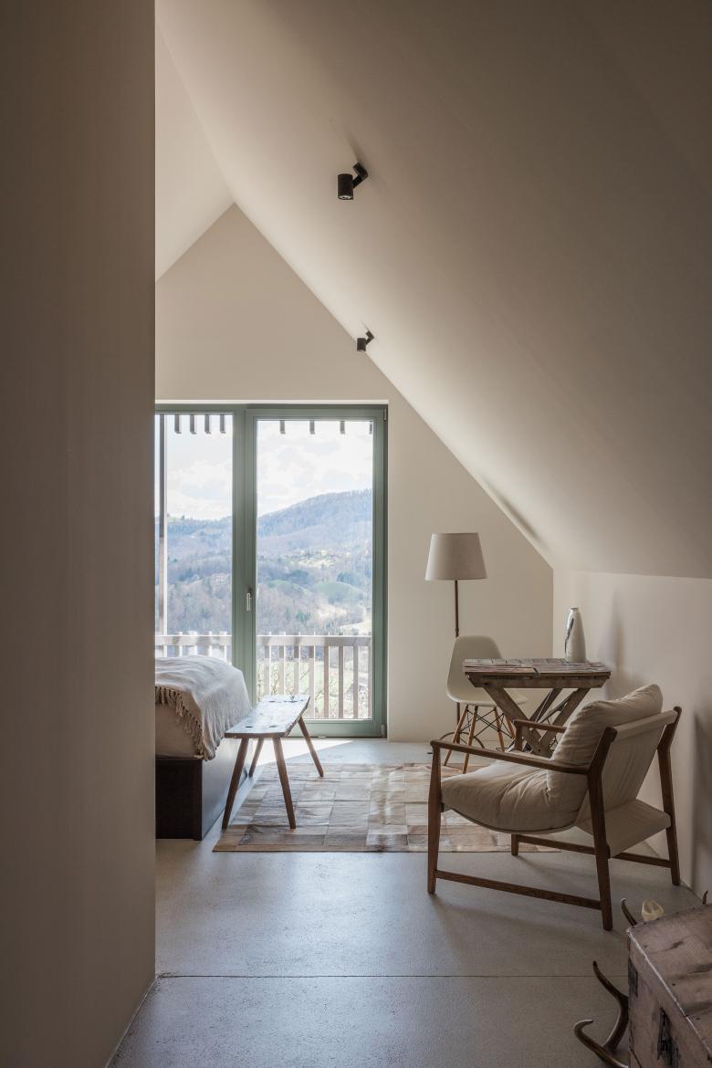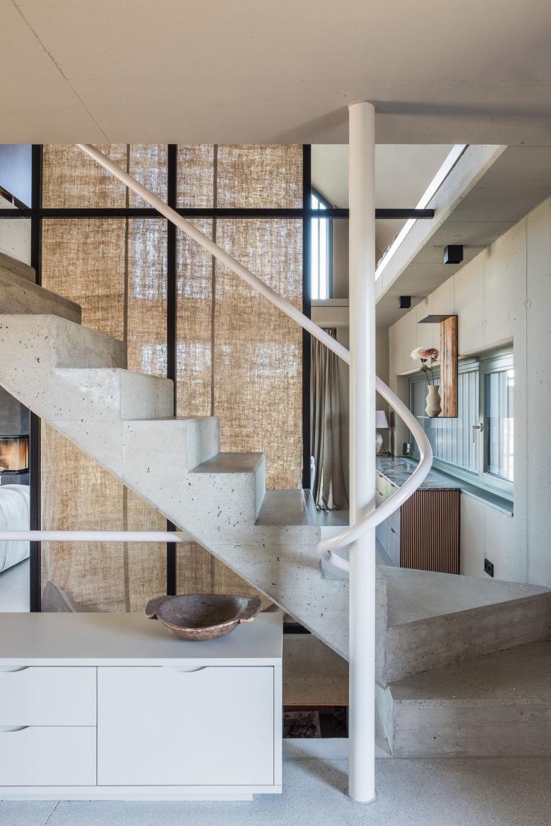 Wir beginnen immer mit einer atmosphärischen Idee, recht unbestimmt, eher ein Gefühl. Kein Weiß, das war klar, eher weiche, gedeckte Farben mit leichten Differenzen als ruhige Grundstimmung. Materialien wie altes Leinen und Holz bringen erste Texturen und schaffen Verbindungen. Die Konzentration auf räumliche Aspekte bleibt auch bei unseren Interior-Arbeiten ein zentrales Thema. Räumliche Sequenzen werden mit Farbe und Material herausgearbeitet. Eine Lamperie umschließt im Schlafzimmer das Bett, eine mit Stein belegte Nische dient der Hygiene, eine alte, gewölbte Ziegeldecke klärt die Grundstimmung der Küche. Das Musikmöbel auf der Galerie ist hoch genug, um auf dem Sofa dahinter verborgen zu schlummern. Erst auf den zweiten Blick werden leichte Irritationen sichtbar. Wie funktioniert die Raumgeometrie im Gästebad? Ist das ein Rosa, da am Geländer?