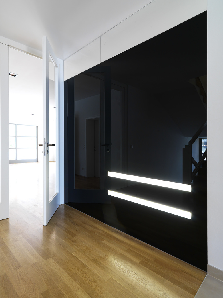 Neue Wand- und Fassadendurchbrüche dienen einer optimierten Lichtführung und unterstützen Raumzusammenhänge. Um die bestehende Kubatur, die wesentlich durch die Dachausbildung geprägt wird, in ihrer Form nicht aufzulösen, ist die neue Terrasse eingeschnitten. Der darunter befindliche Außenbereich erhält mittels Glasböden zusätzlich Licht. Diese Helligkeit wirkt in den Wohnraum hinein.