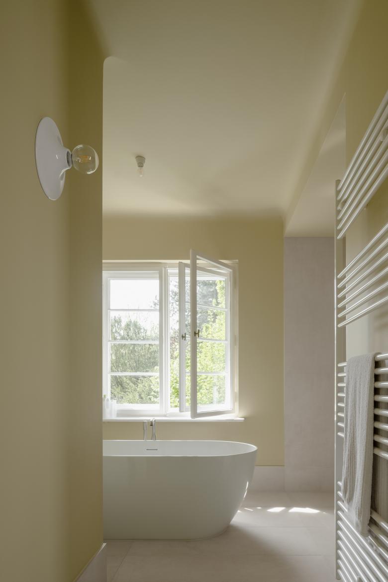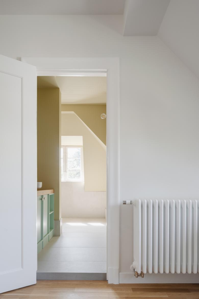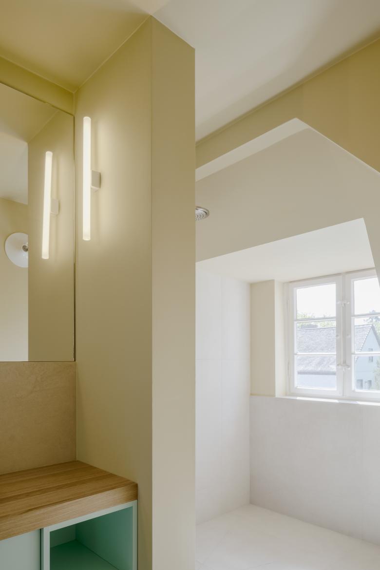 Das Familienbad im Obergeschoss war neben der Küche ein wichtiger Baustein bei der Modernisierung des Hauses. Das alte Bad war viel zu klein für vier Personen und bot zu dem keine bodengleiche Duschmöglichkeit, sondern nur eine Badewanne. Neben der kompletten Neuinstallation der Sanitärleitungen , Abwasser, Kalt- und Warmwasser sowie Heizung und Elektro, musste ein kleines separates Zimmer mit dem alten Badezimmer zu einem neuen Raum zusammengefügt werden. Ein wichtiges Merkmal des neuen Bades ist das separierte WC. Das Badezimmer ist zwar ein offener Raum, jedoch in verschiedene Zonen eingeteilt, so dass das Nebeneinander der Familienmitglieder im alltäglichen Rhythmus nicht zu Störungen führt. Duschen und Baden ist ein Bereich, das WC ein anderer und das schnelle Händewaschen und Zähneputzen neben der Tür. Das neue Bad ist licht und hell und lässt einen entspannt in den Tag starten.