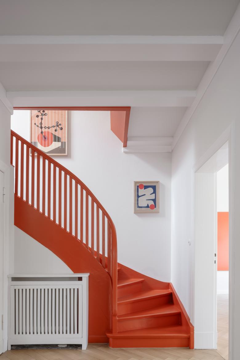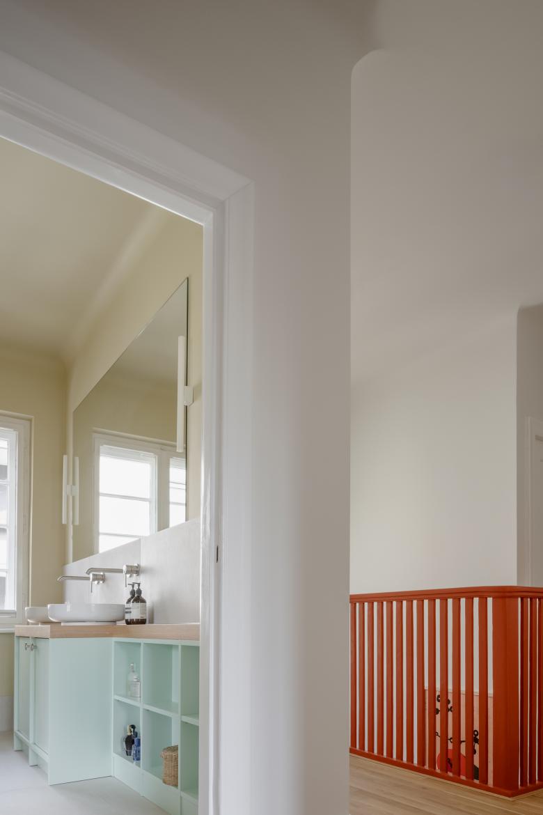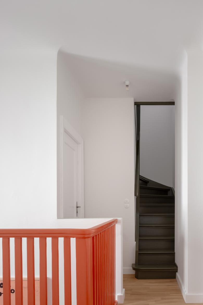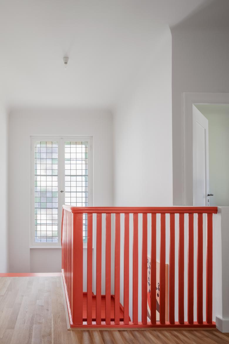 Neben diesen beiden Hauptaufgaben, gab es noch eine Reihen von kleinen Maßnahmen, welche dem Haus insgesamt einen hellen und freundlichen Charakter verschafft haben. So waren die vielen Holzarbeiten im alten Haus, zum Beispiel im Flur mit dem Kamin, dunkel bis schwarz gebeizt und führten so zu einem sehr rustikalen und introvertierten Ausdruck der Räume. Wunsch der Baufrau war es, die Räume hell und freundlich zu gestalten. Ein Farbkonzept zeiht sich durch das gesamte Haus und verbindet die Etagen mit einander. Die rote Treppe ist der bunte Dreh- und Angelpunkt des Hauses. Eine neue Sitzecke mit Liegemöbel hat sich mittlerweile als Lieblingsecke der Familie entwickelt, Hier wird Vorgelesen und gemeinsam entspannt. Das Dachgeschoss wurde ausgebaut und neben dem Wohnflur und zwei Schlafzimmern, ein zusätzliches Badezimmer eingebaut, mit Dusche und WC.