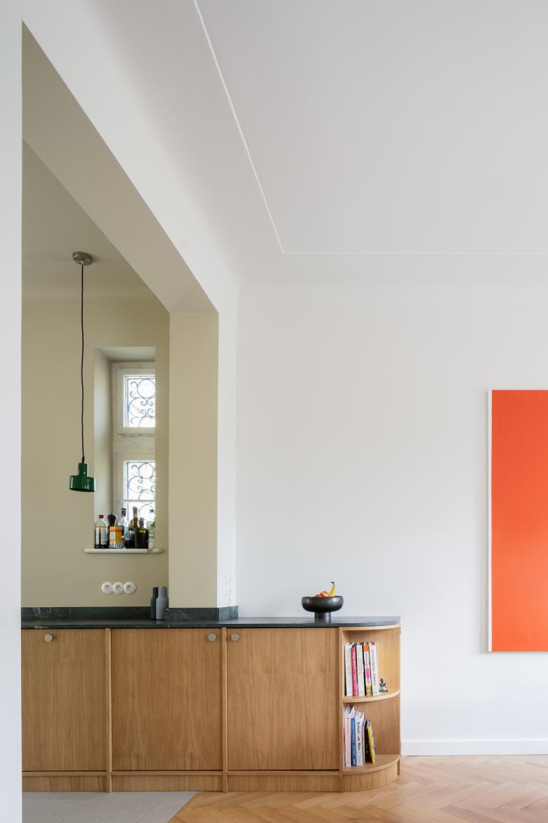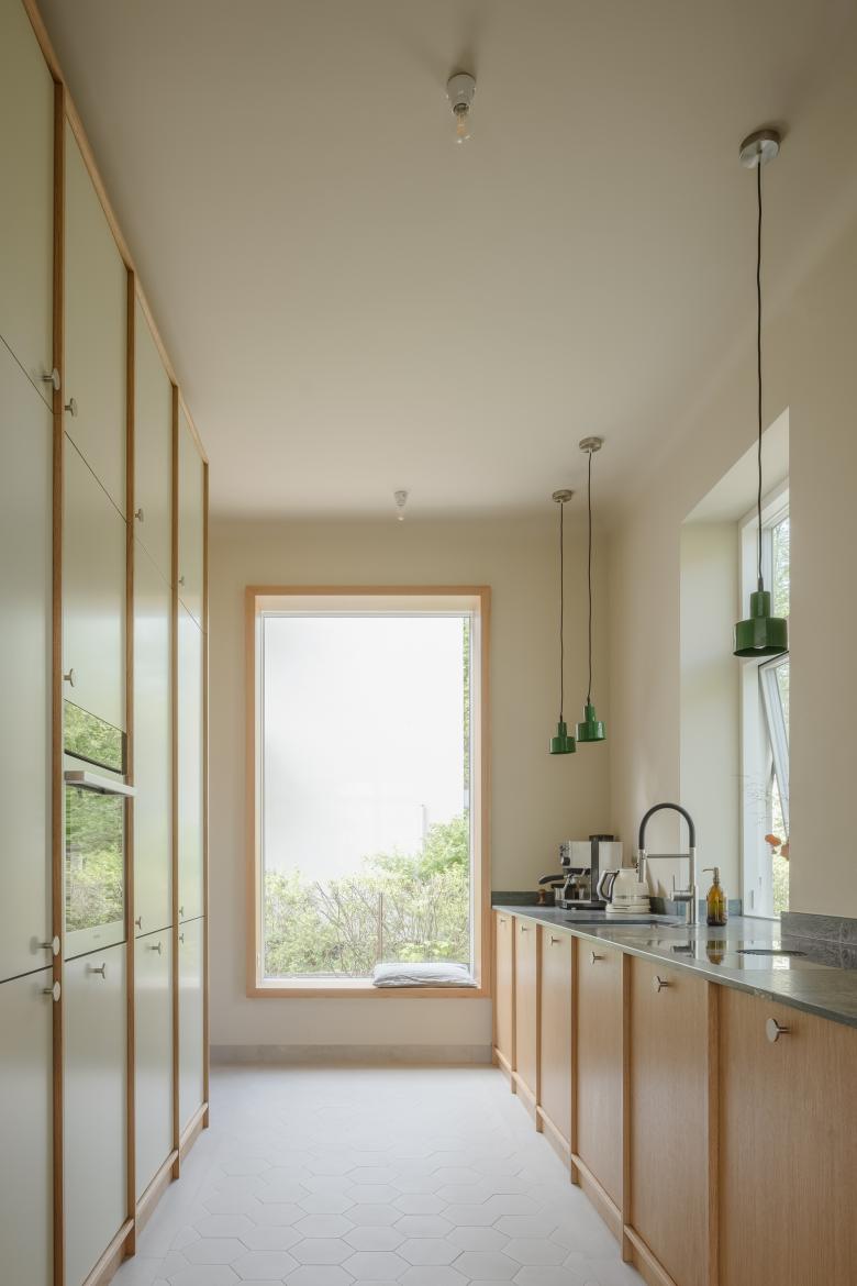 Die alte Küche war sehr kleinteilig mit mehreren Kammern und einer relativ kleinen Tür zum Ess- und Wohnbereich geöffnet. Die Kammern wurden zurückgebaut, die Wandöffnung zum Esszimmer wurde vergrößert und es wurde in der Achse des Durchgangs ein neues, festverglastes Fenster eingebaut, welches mit einer Sitznische kombiniert ist und das Zusammensein rund um den Herd unterstützt. Auch das Fenster zum Vorgarten wurde erneuert und gegen ein modernes, nach außen öffnendes Schwingfenster ausgetauscht, da das alte Fenster für die neue Arbeitsplattenhöhe zu tief in der Wand saß. In Kombination mit der raumgreifenden Küchenzeile, welche sich mit einer Rundung bis in das Esszimmer schiebt, entstand so eine moderne, offene Wohnlandschaft, welche das Kochen und Essen in den Mittelpunkt des Familienlebens rückt.