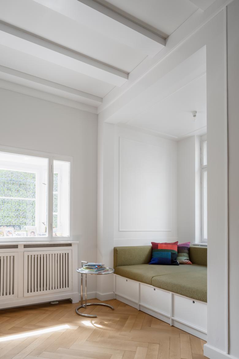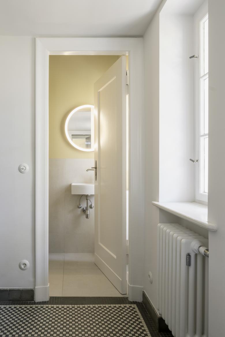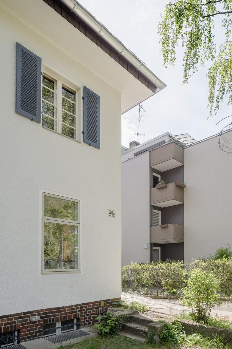 Das Haus war weitestgehend noch im Originalzustand, mit schönen, für diese Epoche typischen, schlichten Altbaudetails wie Eichenparkettböden, einer Stuck-Hohlkehle als Übergang zwischen aufgehenden Wänden und Decken, schlichten Vollholztüren und Messingbeschlägen sowie einem Mosaikfliesenboden im Eingangsbereich. Jedoch entsprachen die Küche, die Bäder und die Haustechnikinstallationen nicht mehr dem aktuellen Stand und den heutigen Wohnbedürfnissen. Das Dachgeschoss war umausgebaut und beherbergte lediglich in einem kleinen Teil ein ausgebautes Zimmer.