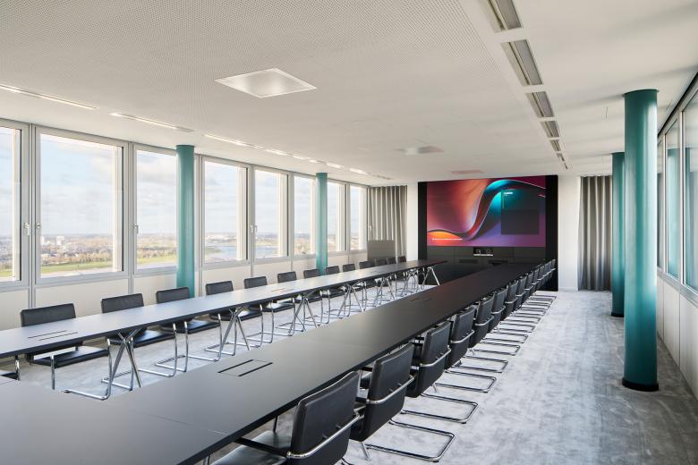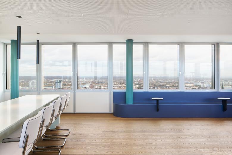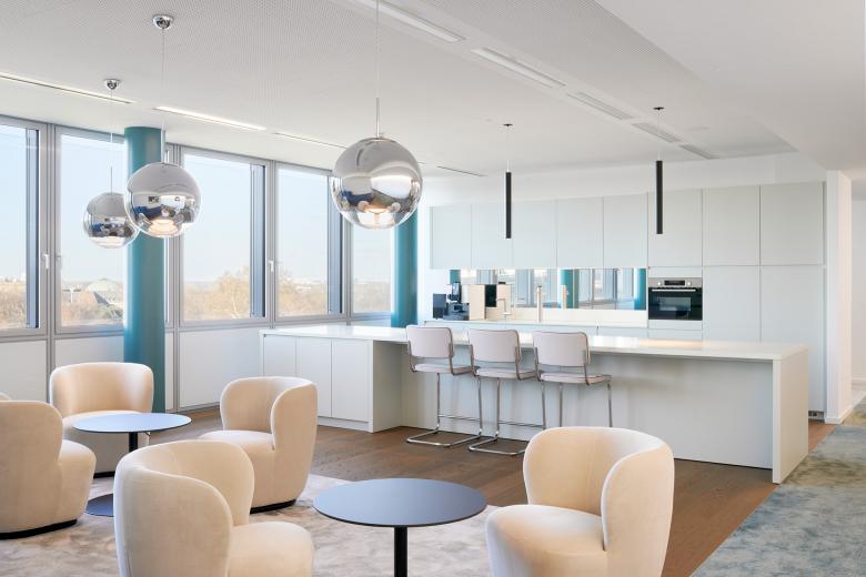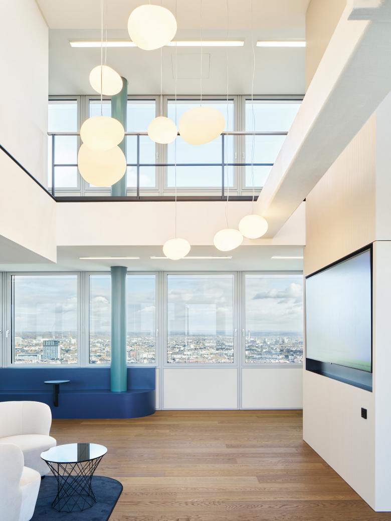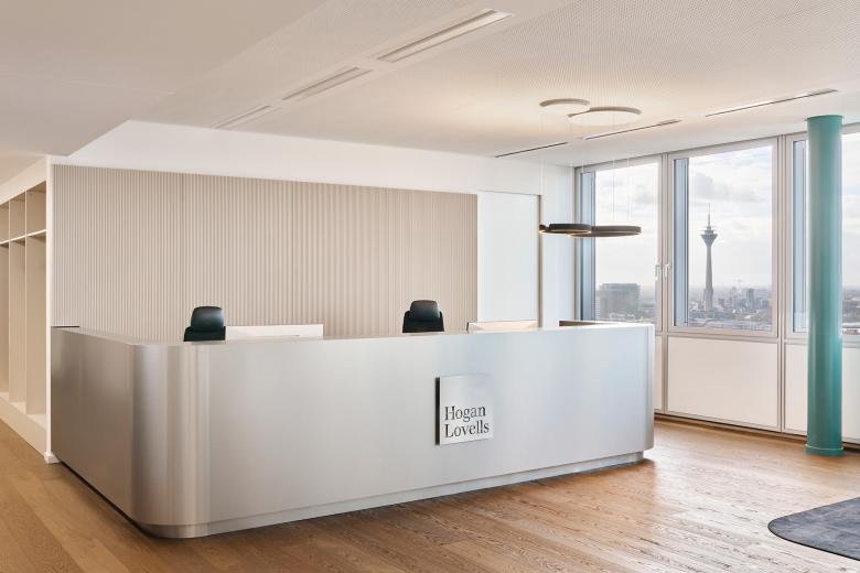 CSMM entwickelte für Hogan Lovells ein maßgeschneidertes Raumkonzept über zehn Etagen des denkmalgeschützten Dreischeibenhauses in Düsseldorf. Die Büroflächen wurden durch eine interne Treppe verbunden und durch großzügige Community Spaces auf jeder zweiten Etage ergänzt, um die Kommunikation und den Austausch zwischen den Mitarbeitenden zu fördern. Eine besondere Herausforderung stellte der Denkmalschutz dar, der kreative Lösungen für Farbgestaltung, Beleuchtung und statische Eingriffe erforderte, insbesondere bei der Verbindung der Geschosse 22 und 23. Das Farb-, Licht- und Materialkonzept integriert den Bestand sensibel und schafft gleichzeitig eine moderne, repräsentative Arbeitsumgebung für die Kanzlei. Mit lichtdurchfluteten Räumen, einer klaren architektonischen Sprache und einer Dachterrasse mit Blick über Düsseldorf entstand eine Arbeitswelt, die höchste funktionale und ästhetische Ansprüche erfüllt.