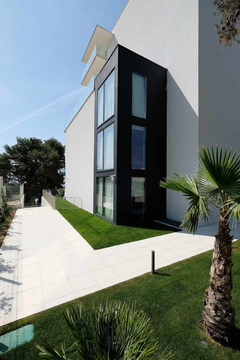 Als Form wurde ein liegender Quader gewählt, der über ein niedriges Element an den Altbau andockt. Der „Würfel“ ist straßenseitig in Glas aufgelöst, um Licht zu gewinnen und zugleich die herkömmliche Mittelgangstruktur von Hotels zu vermeiden. Die Gänge wurden als Galerien hinter der Straßen-fassade abgehängt, die unteren Geschosse verbindet eine raumgreifende Kaskadentreppe im Zwischentrakt. Die Meer-Fassade wird durch die vorkragenden Deckenplatten räumlich aufgelöst; hier liegen die jedem Zimmer zugeordneten Balkons mit Aussicht auf die Adria.
