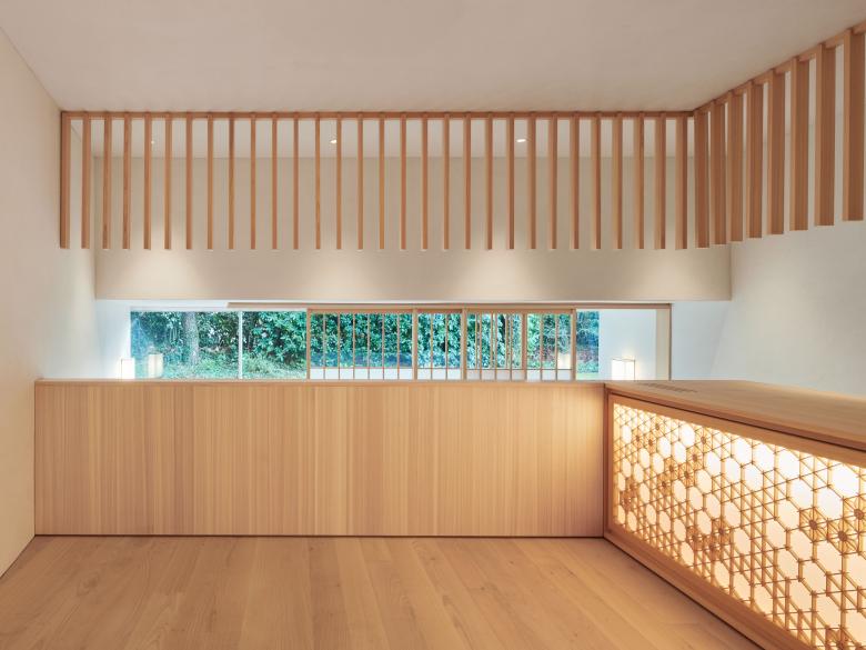 Material selection was fundamental to this process. Yoshino cypress from Nara Prefecture - a rare and refined material known for its straight grain, soft pinkish hue, and natural luster - forms the primary framework. Suspended cypress louvers modulate light and shadow, reinforcing a sense of spatial layering. Shoji screens, tatami mats, and hand-finished plaster walls, crafted in collaboration with Japanese artisans, further articulate the composition.