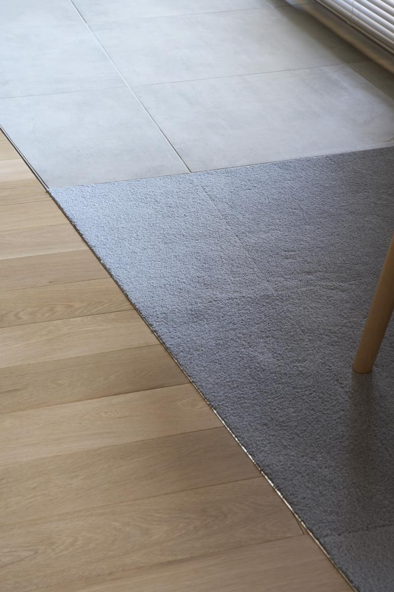 The wood flooring is chosen for living/ dining room and bedroom for barefoot comfort, and the walls and ceilings are mostly white to give neutral finish. The “Shores” floors are either tiles or carpet depending on its function, and the walls and ceiling are finished in two colors. One is a red brown sampled from the surrounding environment seen outside the railroad side of the window, and the other is a moss green sampled from a café run by the client that is within one-minute access from the door of the apartment.