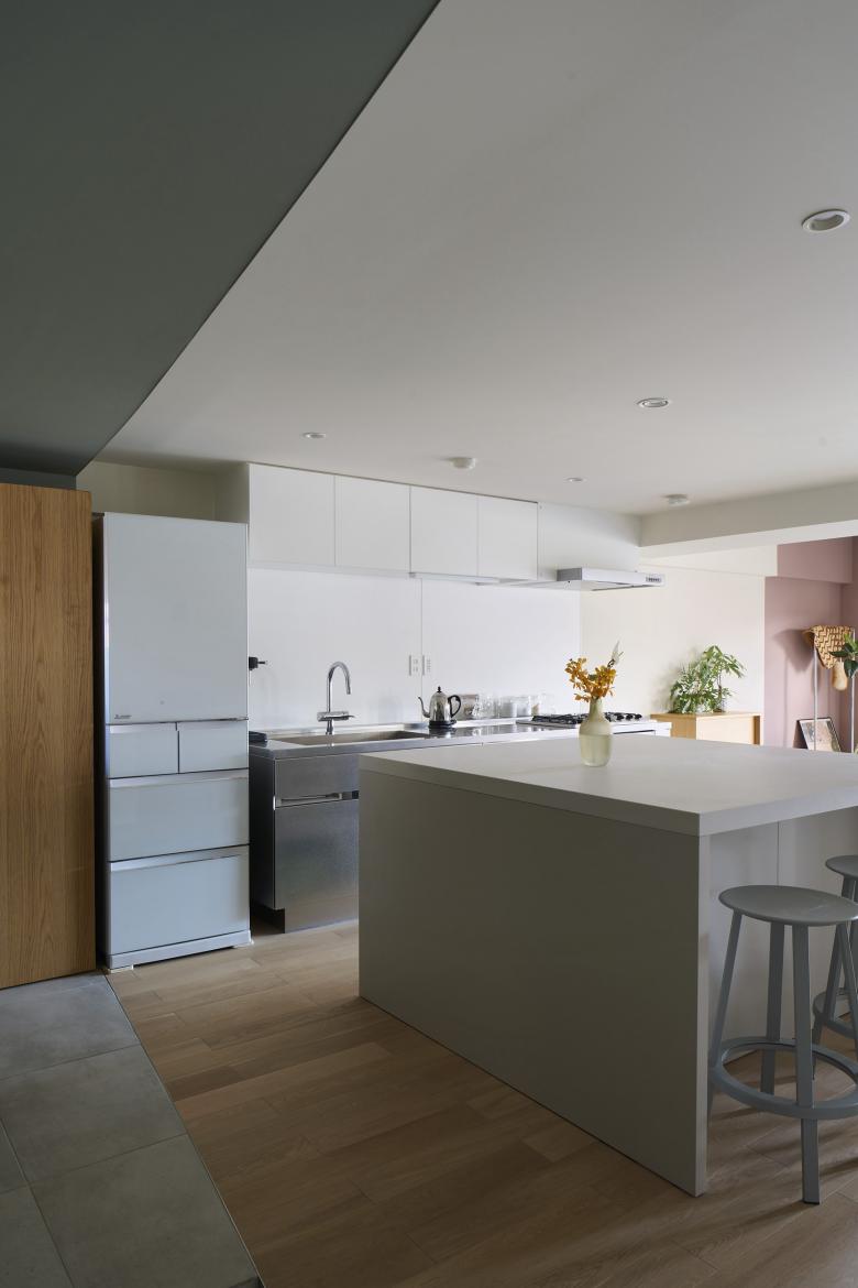 For this reason, the kitchen island countertop is placed in front of the entrance on the hallway side so that it catches attention of the visitors when they open the door. The square shape of the countertop provides good accessibility, storage space and workability.