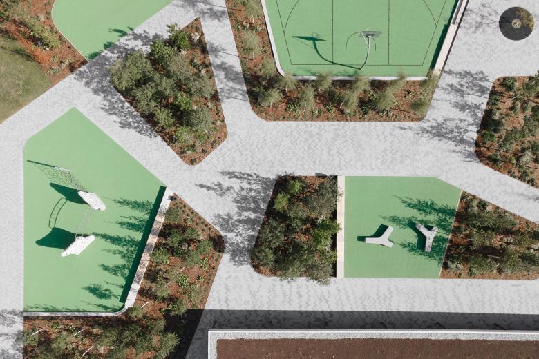 The open spaces are divided into three areas: school grounds, sports facilities and public ‘green spaces’. The design feature of ‘green cabinets’ as a recurring motif brings the planning area together into an independent unit that creates a sense of identity for the neighbourhood.