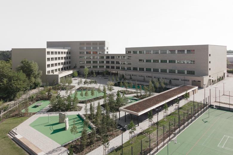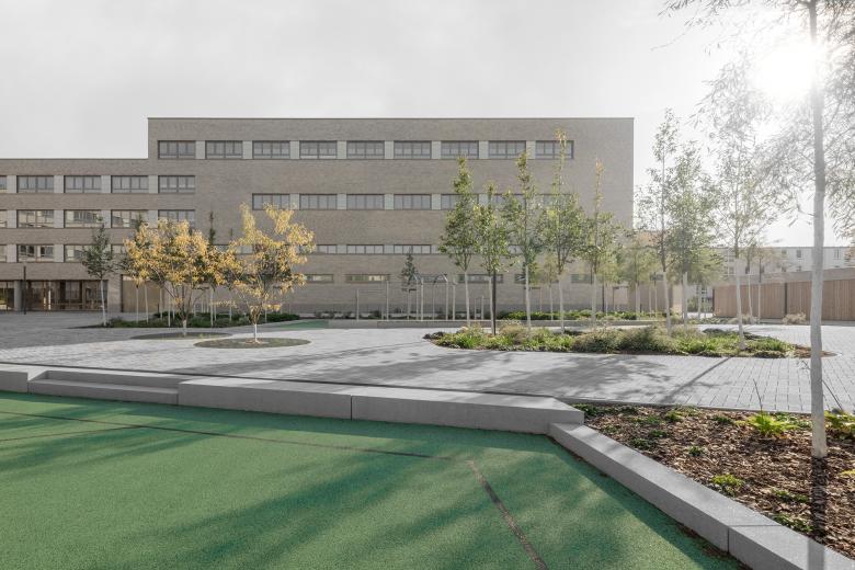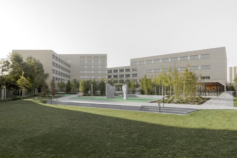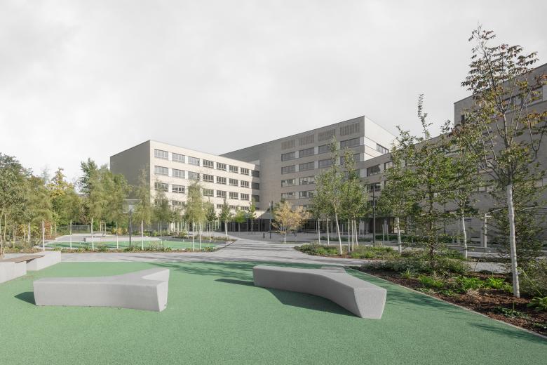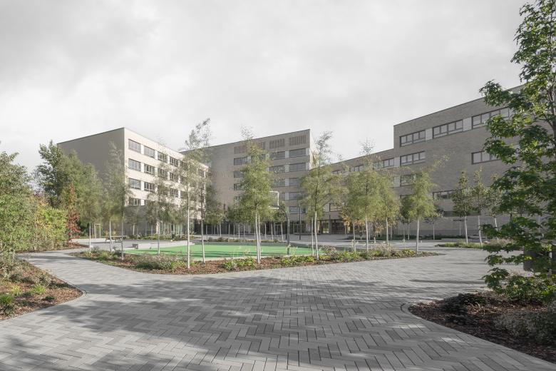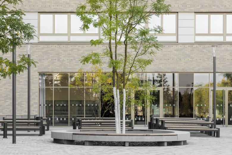 A biotope located at the intersection with its magnificent solitary trees has been largely preserved, secured and integrated into the overall design. A functionally coordinated juxtaposition of paved and unpaved areas characterises the future square-like entrance as well as the break and courtyard areas.