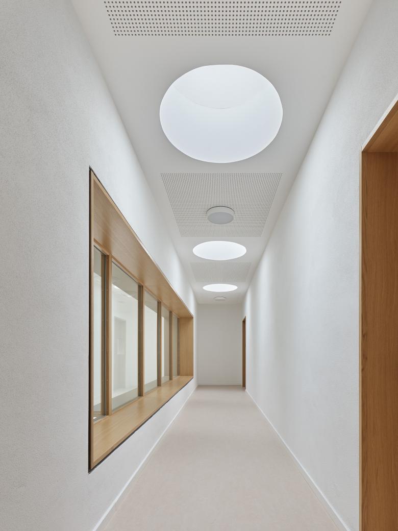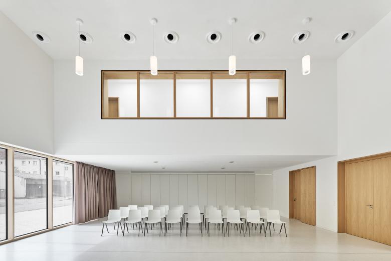 Die beiden leicht zueinander versetzten Baukörper spannen den gemeinsamen Vorplatz auf und definieren den Eingangsbereich des neuen Quartierszentrums. Die beiden Nutzungsbereiche sind Außen wie Innen klar ablesbar. Die gemeinschaftlich genutzten Flächen am Foyer stärken den inklusiven Gedanken des Projektes. Der zweigeschossige, multifunktional nutzbarer Saal im Erdgeschoss bildet das Herzstück des neuen Johannesforums und ermöglicht vielfältige Begegnungen. Ein großzügig gerahmtes „Schaufenster“ ermöglicht die Verbindung zwischen Innen- und Außenraum. Durch den Erhalt des freistehenden Kirchturmes, die Weiterverwendung des eingelagerten Natursteines und den Einbau alter Kirchenfenster konnte die Identität des Ortes beibehalten werden.