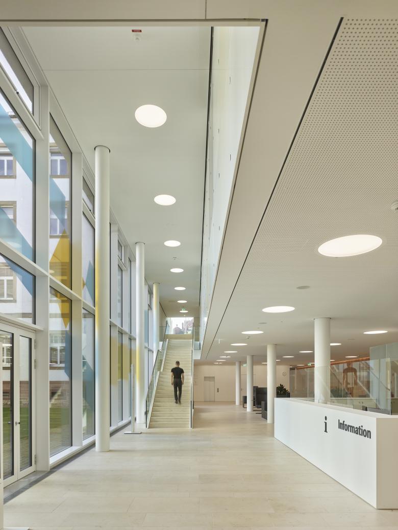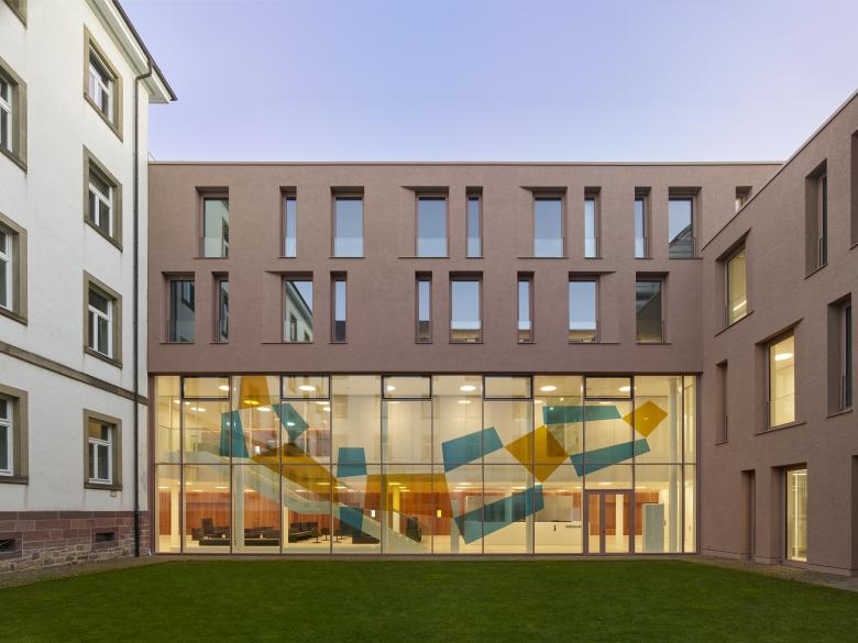 The new extension on Holzmarkt square will be built in the inner area of the city block and take up all departments with contact with the public, especially the rooms for the criminal and family courts. The main access will be via the existing western yard, the entrance hall will open to the yard in the middle. All existing wing buildings will be connected to it. The new building will be an autonomous and natural addition to the listed ensemble. The façade will be made of prefabricated concrete elements dyed in reddish hues, showing a range of varying diagonal reveals that will create proportions appropriate to the situation.