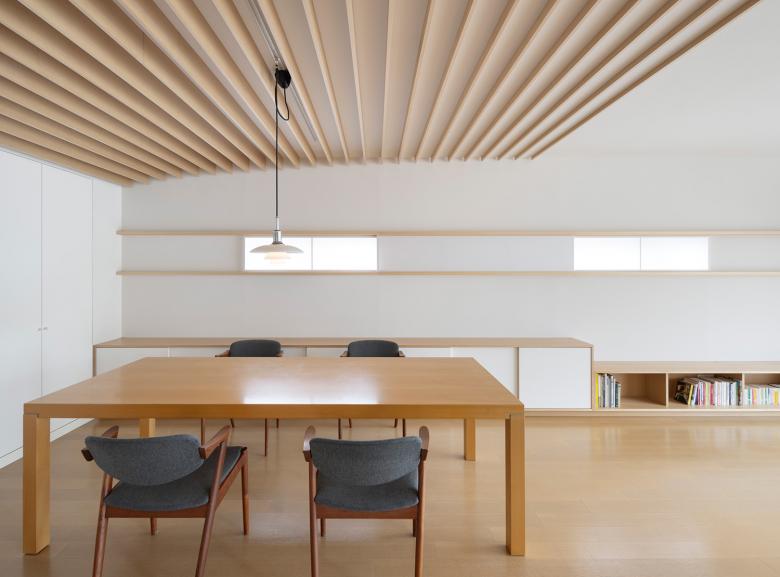 Rhythmic louvers, installed to eliminate the difference in the ceiling level, tie the dining room space together. Around the windows, shoji screens with the cleats on the reverse side allow for different views during the day and at night. In addition, bookshelves extending from the dining room to the living room connect each room, creating a sense of unity in the space. The furniture design is based on beech wood and off-white tones, and the light gray walls harmonize with the existing furniture, creating an elegant atmosphere.