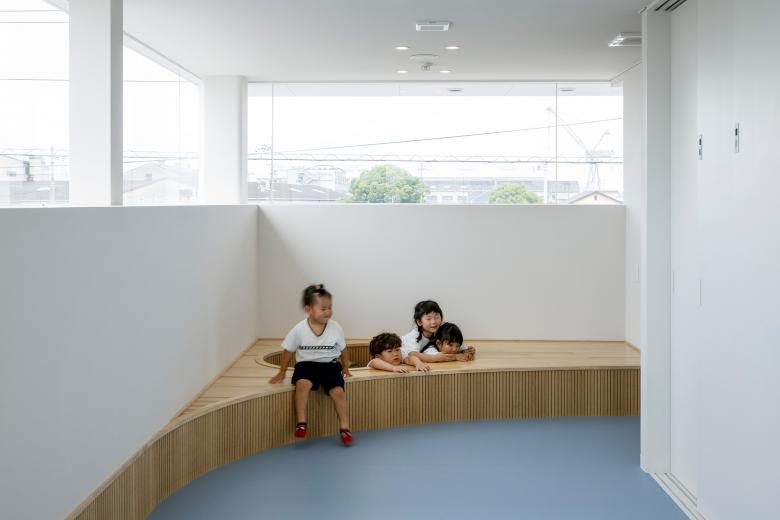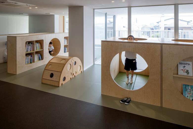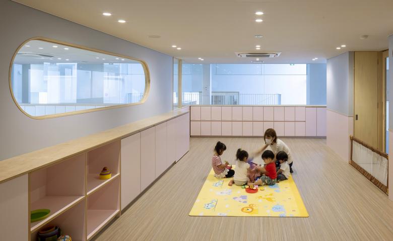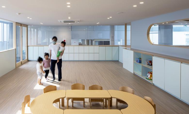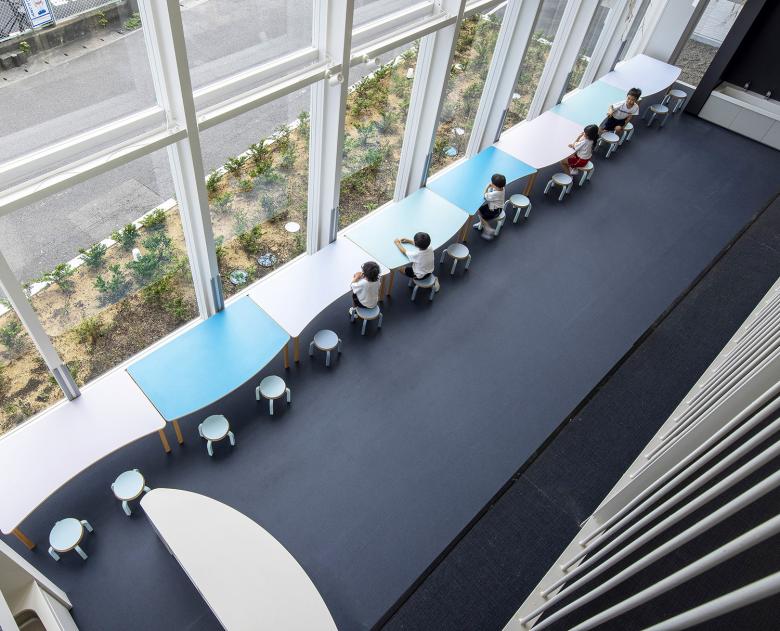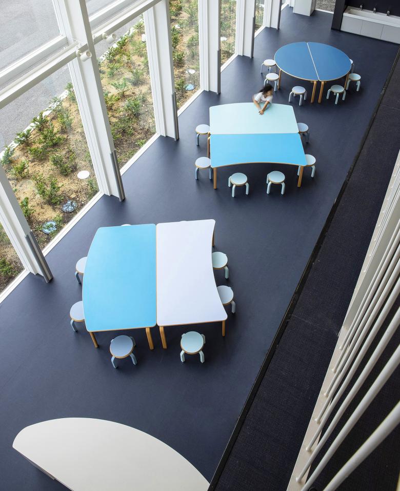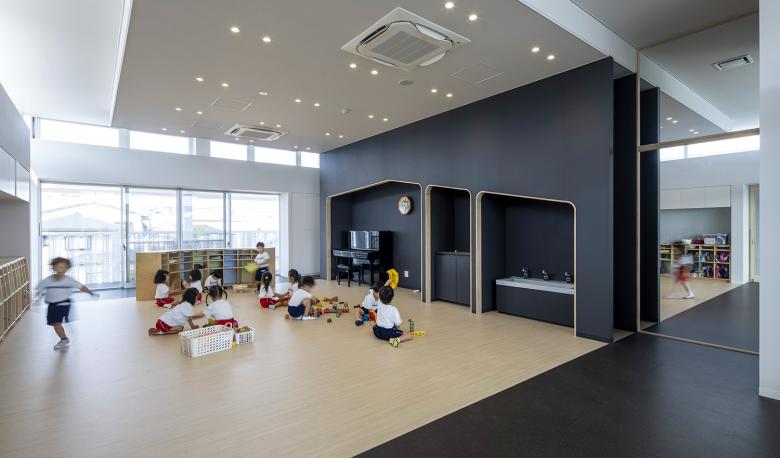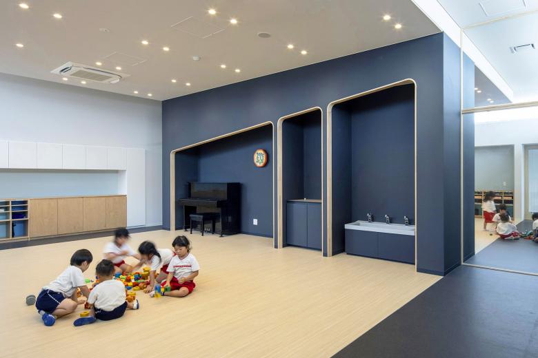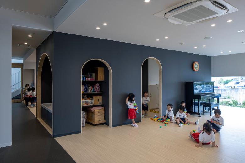 The theme of the preschool building was “a space where children can think for themselves and stimulate their imagination” and “a preschool that is like a museum. Dark gray boxes were placed in each room to blend in with the piano. The color of the classrooms and the shape of the wooden crates were changed for each grade level so that the children could identify their class. The lunch tables were made square or round, or connected to form a wave shape, so that the space could be changed according to use and number of children.