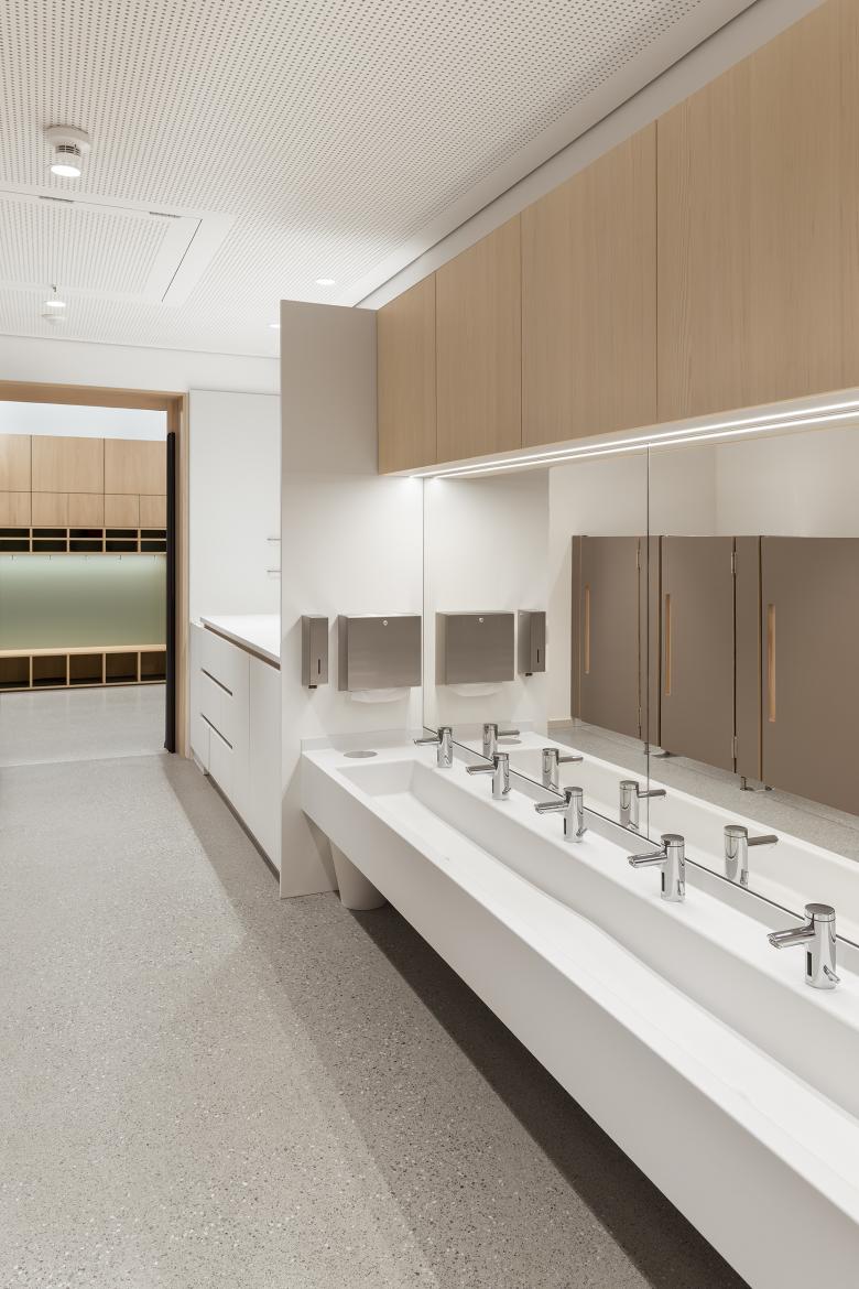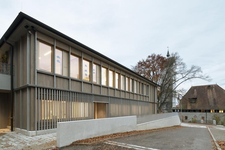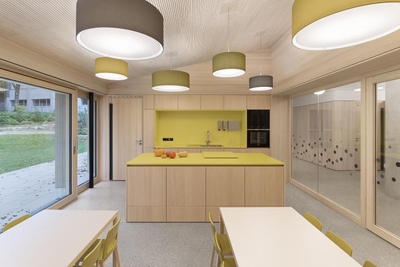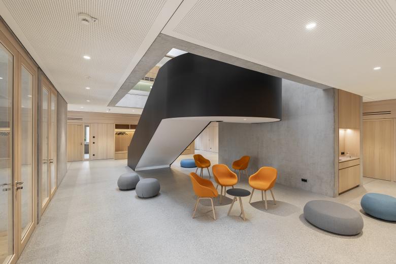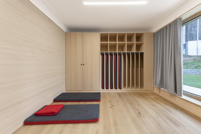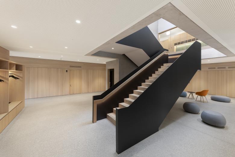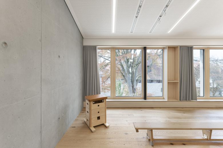 Das Raumprogramm des Gemeindehauses folgt dem Windmühlen-Grundriss und erlaubt somit grösstmögliche Funktionalität. Innerhalb dessen vier Schenkel bildet der von oben belichtete Erschliessungskern das Herz des Gebäudes, um den sich im Erdgeschoss die Verwaltung, das Foyer samt Ideencafé und Küche sowie der grosse Saal mit zuschaltbarem Multifunktionsraum reihen. Die schwarze Treppe im Kern zeigt gestaltgebende Präsenz und kontrastiert im lichten Luftraum in Sichtbeton. Der Kindergarten im Obergeschoss besteht aus zwei funktionalen, voneinander unabhängigen Gruppenclustern. Die bis an die Fassaden geführten Flure gewährleisten eine einfache Orientierung für die Kleinsten. Sie bieten Ausblicke und Orientierung in alle vier Himmelsrichtungen und schaffen überdies hinaus tageslichtorientierte Nischen für Sondernutzungen wie Elternecke oder Bastelraum.