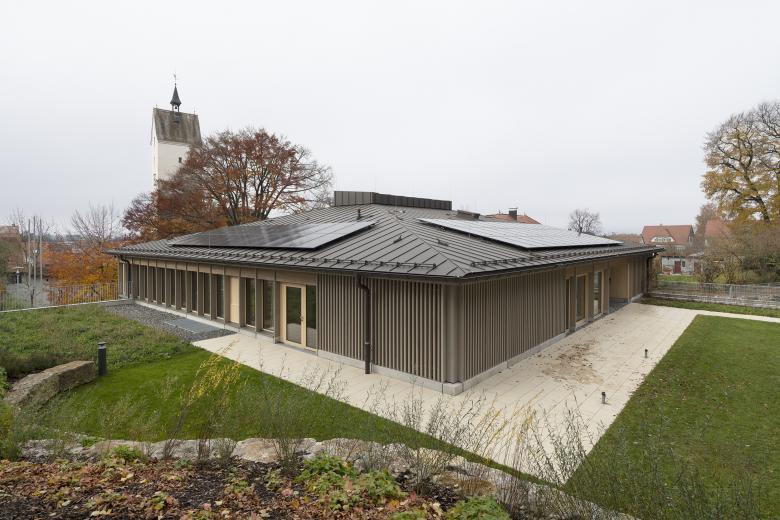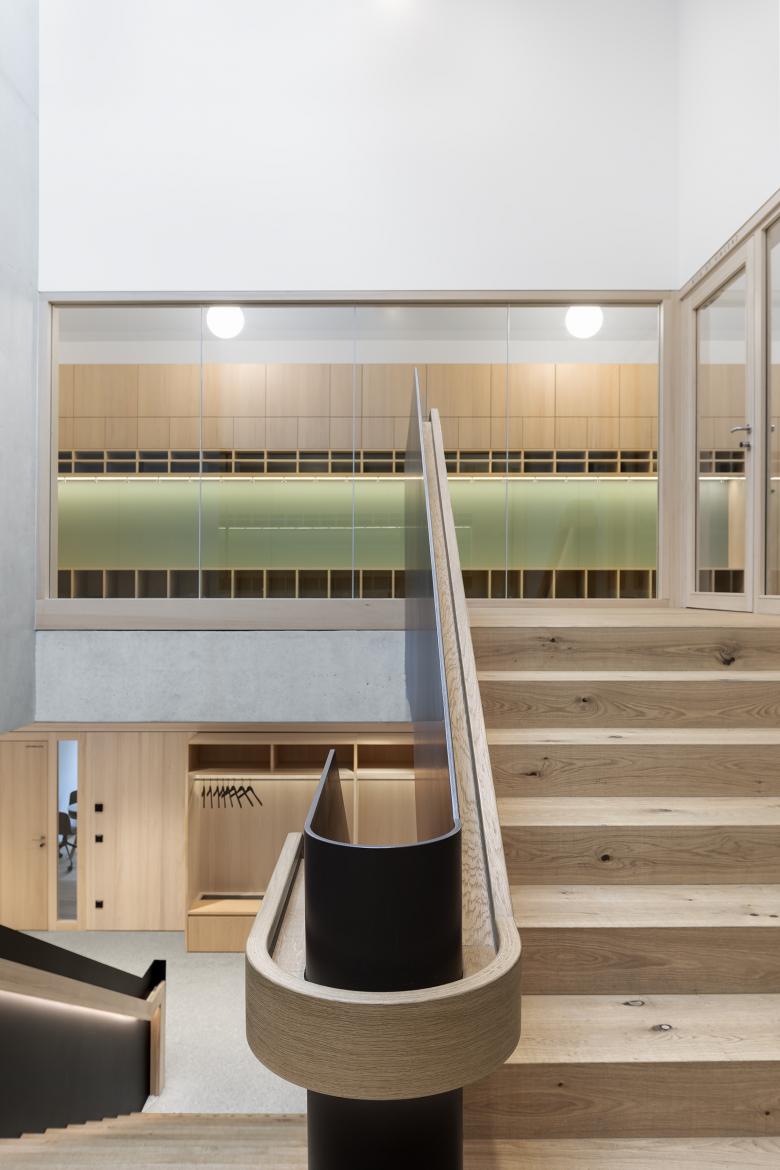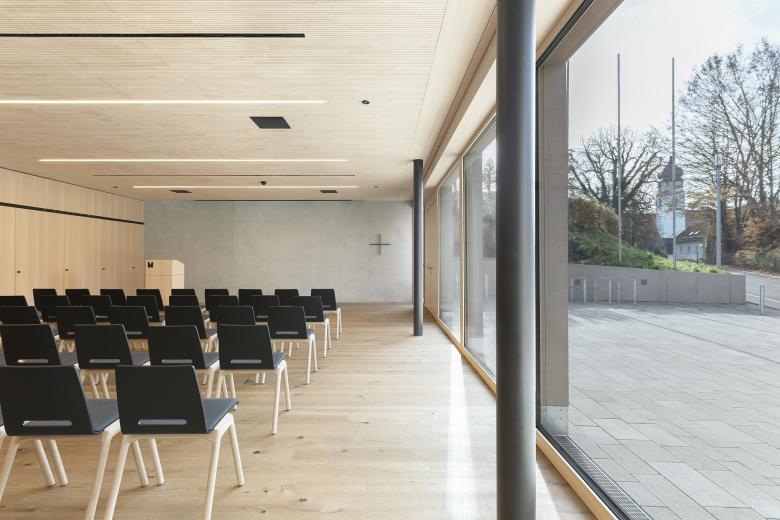 Der homogene Innenausbau aus Weisstanne wird mit Eichenholz und schwarzem Stahl der Treppe, sowie geschliffenen Sichtestrich harmonisch und funktional ergänzt und schafft eine angenehm natürliche Atmosphäre des Willkommen-Seins für alle Nutzer und Besucher des neuen Gemeindehauses.