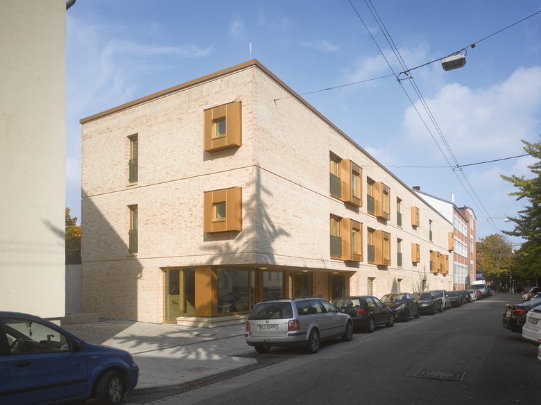 In Nachbarschaft zu den Siedlungshäusern und Gewerbeflächen der Neckarvorstadt bietet der dreigeschossige Neubau mit seiner hellen Klinker-Fassade und den goldfarbenen Metallerkern dem Betrachter ein ganz neues, ungewohnt frisches Bild. Der Kita-Eingang liegt in Gebäude-Längsrichtung, witterungsgeschützt in das Erdgeschoss eingeschnitten. Entlang einer Fensterfront ist bereits ein erster Blick ins Gebäudeinnere möglich, bevor das Portal die Kinder und Eltern empfängt. Die innere Gliederung auf dem langgestreckten Rechteckgrundriss ist in Zonen optimal gelöst und funktional durchdacht. Sie bietet auch kleinen Kindern gute Orientierung. In Eingangsnähe sind ein Elterncafé, zwei Veranstaltungsräume und eine Sanitäranlage um ein kleines Foyer gruppiert. Dieser Bereich steht als Familienzentrum allen Bewohnern des Viertels offen. Das zentrale Treppenhaus mit Aufzug teilt den Grundriss mittig, im rückwärtigen Erdgeschossbereich sind die Personalräume und der Küchenbereich mit separatem Zugang untergebracht.