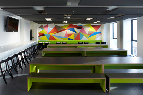 Kingswood Academy is a new secondary school in Bransholme, a suburb in the north-eastern outskirts of Kingston Upon Hull. A four-storey saw-toothed super-shed announces itself with a profiled roof and largely-glazed south-western face to greet a new public piazza at the front of the site. Internally, the ground-floor plan is defined by a central street lined with a series of open plan studios for group and independent learning. The inner street’s dramatic main staircase simplifies circulation and, in rising up through the central multi-storey atrium, creates both spectacle and opportunities for passive surveillance. Robust and bold, the college caters for 1,300 students and 128 staff and incorporates a number of community facilities including training rooms, crèche, café and sports hall.