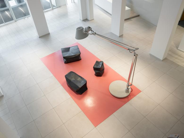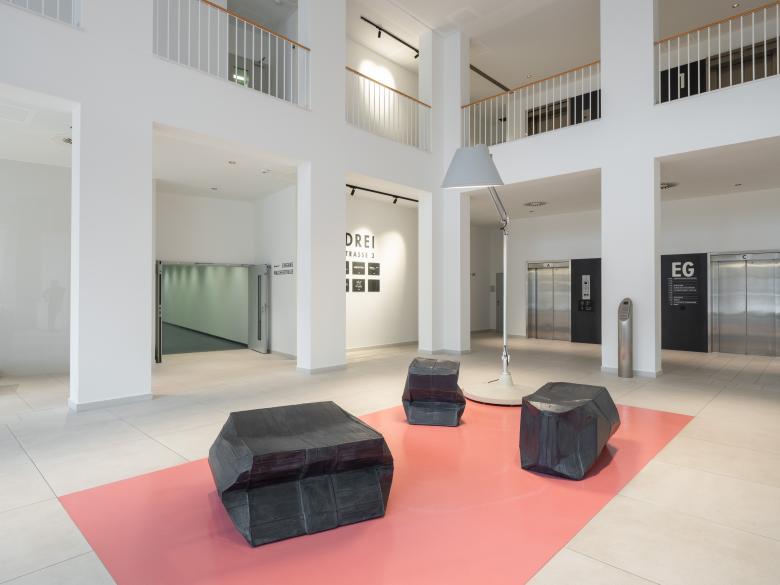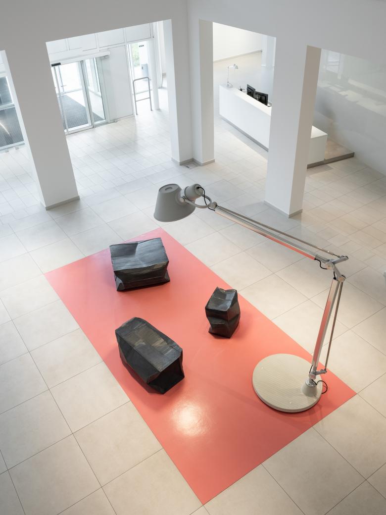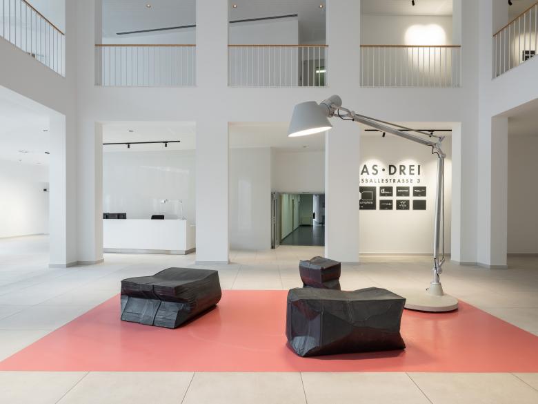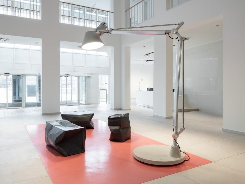Betritt man das Bürogebäude LAS DREI am Wiener Praterstern wird man „kunstvoll“ empfangen. Der Eingangsbereich des 10-geschoßigen Bürohauses wurde nach einem Konzept von Christian Heiss, Atelier Heiss Architekten, gemeinsam mit dem österreichischen Künstler Peter Sandbichler neugestaltet. Der ursprüngliche Raum wurde komplett aufgemacht, die vorhandene Stiege entfernt und so ein großzügiges, klar strukturiertes Foyer geschaffen. Dieses macht sofort neugierig – auf die Kunst, auf das offene erste Obergeschoß, das man von unten sehen, aber nicht einsehen kann. Angezogen vom lachsroten „Teppich“, fällt der erste Blick zunächst auf die von Peter Sandbichler geschaffenen Kunstobjekte „Bank“ und „Hocker“, die man „begreifen“ und „besitzen“ kann, und wandert dann weiter zur übergroßen Tolomeo-Stehlampe von Artemide.