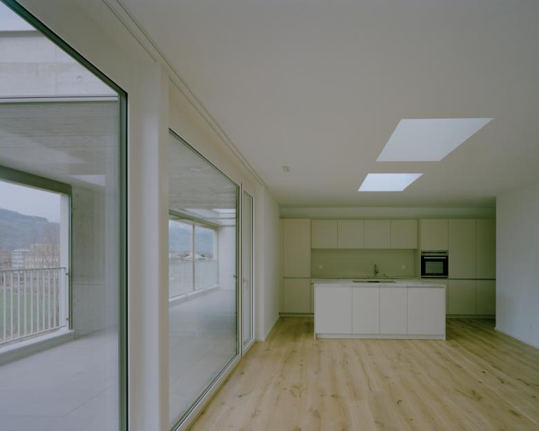 The different apartment sizes are characterized by differentiated living qualities. They are each provided with spacious outdoor spaces which are directly oriented to the covered loggia. The outer apartments are each oriented on three sides while the inner units are aligned on two sides. The building, designed with Scots, is particularly evident on the lower residential floors. Its structure opens up to the top, which is widely. The zoning in day and night areas is the central point of the design idea in all apartments. From the outside, the building is shown with a simple pane and panel structure. Reserved and timeless in materialization, it embeds itself in the green outdoor space.