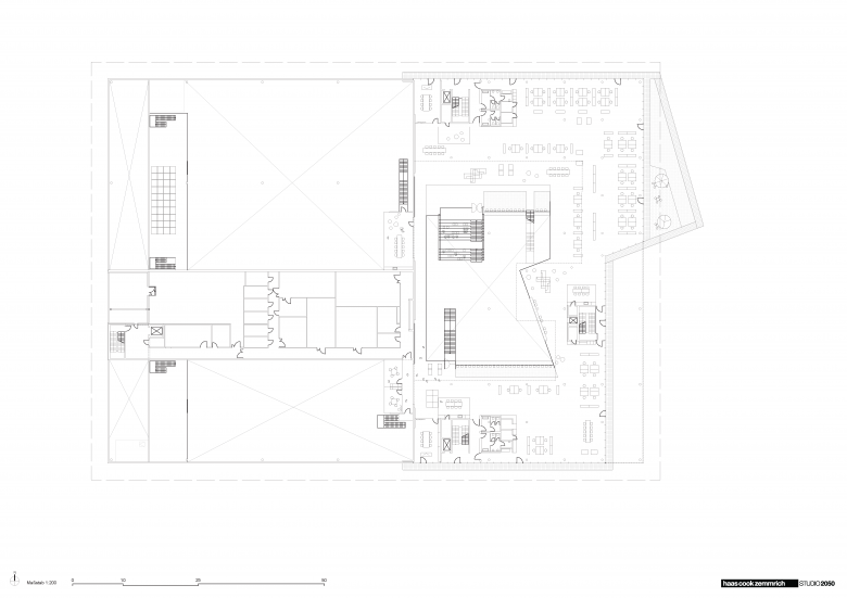An open working landscape extends across 3 floors of the office building offering space for about 115 employees together with enough space for future growth. The concept of uniting all the various functions in one building under a single roof is expressed by the form of the expansive 9,000m² wooden structure spanning the entire building.
