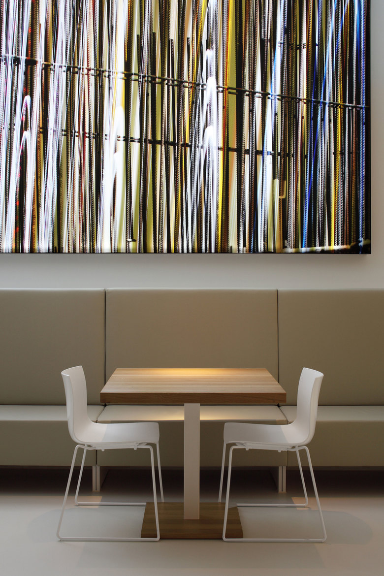 Innenraum – Der Grundriss ist räumlich klar in drei Bereiche gegliedert. Der größere Bereich das Casino - Séparée, Tafel, lange Bank sind für den Mittagstisch konzipiert. Die drei Séparées bieten den Mitarbeitern anschließend Rückzugsmöglichkeiten um Besprechungen abzuhalten. Der rückwärtige Lounge-Bereich wird den gesamten Tag als Cafeteria genutzt. Das neue Erscheinungsbild des Casinos I Lounge ist modern und in hochwertigen Materialien ausgeführt.