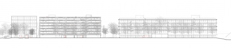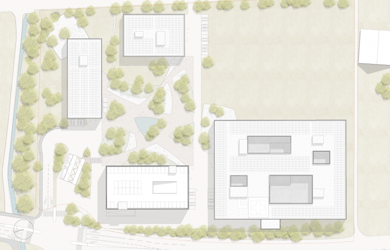 The placing of the four buildings takes account of the nearby motorway, the quality of the landscape, the different lifecycles of the buildings, and the complex access situation. The site starts with a transportation space with a central bus stop. It is adjoined by the calm, traffic-free green centre of the hospital grounds that provides an unmistakable address and creates an identity for the campus-like ensemble; this space will retain all its qualities beyond the life cycle of the hospital.