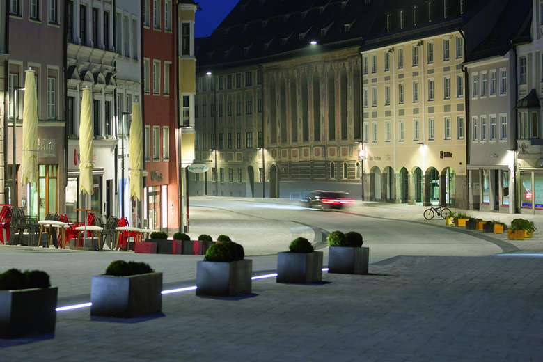 Er heißt nicht Marktplatz, nicht Rathausplatz und ist nicht nach einer historischen Persönlichkeit benannt. Beim Mittelpunkt des städtischen Lebens von Landsberg am Lech ist der Name Programm und so ist er als Hauptplatz im Stadtplan verzeichnet. Seinen ungewöhnlichen, dreieckigen Grundriss säumen das Rathaus, die Pfarrkirche Maria Himmelfahrt, zahlreiche Geschäfte und Restaurants. Sehenswürdigkeiten wie der Marienbrunnen und der Schmalzturm locken Touristen an. An Markttagen und bei Festen trifft sich hier die Bürgerschaft. Nach einer grundlegenden Neugestaltung lockt der Hauptplatz seit Herbst dieses Jahres mit ganz neuen Qualitäten. Eine von ihnen ist die Beleuchtungslösung. Der Platz inmitten der historischen Altstadt wird von modernen LED-Leuchten erhellt, die an Masten, Wänden und Seilen montiert sind.