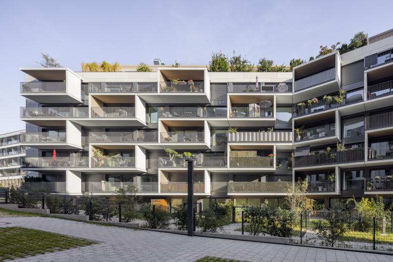 Das komplett in BIM geplante und mit LEED Gold zertifizierte Wohn- und Geschäftshaus ist als Blockrandbebauung auf dem Grundstück platziert. In seiner Mitte befindet sich ein großer Innenhof mit Garten, der für alle Bewohner nutzbar ist. Zwei Gebäudefugen trennen den Blockrand an den Schmalseiten auf. Der südliche Teil beherbergt 67 Wohneinheiten während der nördliche Teil Platz für Büros bietet.