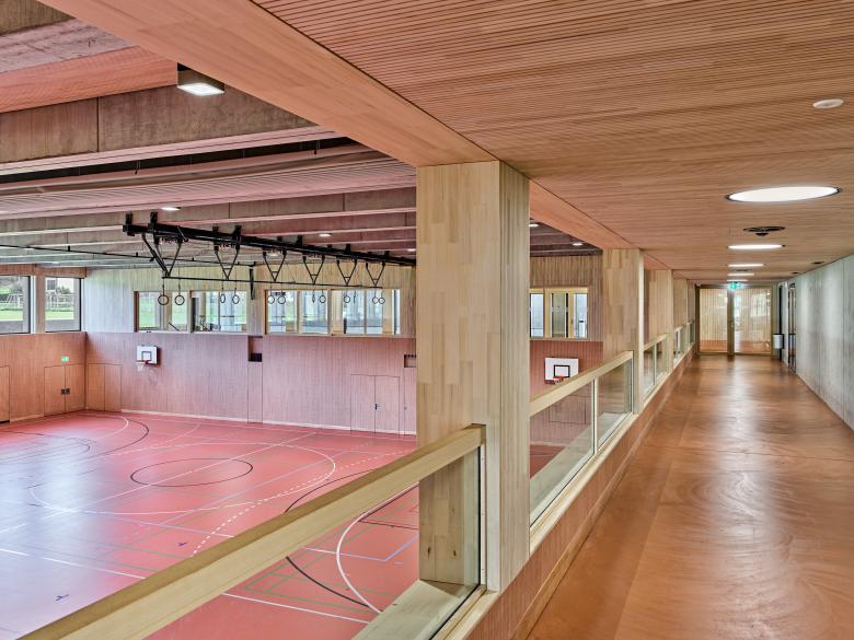 Mit dem Neubau einer Mehrzweckhalle mit Bühne und einem Lehrschwimmbad soll nicht nur dem zukünftigen Bedarf entsprochen werden, sondern auch die städtebauliche Situation des heterogenen Schulcampus geklärt und aufgewertet werden. Die neue Mehrzweckhalle schließt die Schulanlage gegen Nordosten ab und spannt gleichzeitig einen neuen zentralen Pausenplatz im Zentrum des Schulareals auf. Durch die städtebauliche Konzentration der Sportstätten und punktuelle Umstrukturierungen im Bestand entstehen Synergien mit der bestehenden Dreifachturnhalle sowie optimale Betriebsabläufe für Schule, Vereine und Veranstaltungen.
