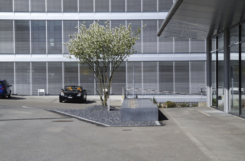 Ein in die Jahre gekommenes Geschäftsgebäude wird von der Bauherrschaft im Rahmen ihrer Geschäftsstrategie erworben und saniert. In diesem Zusammenhang wird auch die vorhandene Umgebung mit Parkflächen und verwilderten Grünstreifen erneuert und der Liegenschaft zu einer neuen, die Geschäftsphilosophie vermittelnden Adresse verholfen. Eine tief geschnittene, immergrüne Steineichenhecke umfasst das Grundstück und betont den Haupteingang. Anthrazitgraue, grossflächige Betonelemente mit farbigen Keramikintarsien schaffen im Schatten der Felsenbirnen Sitzgelegenheiten an ausgezeichneten Punkten. Ein roter Asphaltbelag erstreckt sich vor dem Geschäftseingang und empfängt Kundschaft und Personal.
