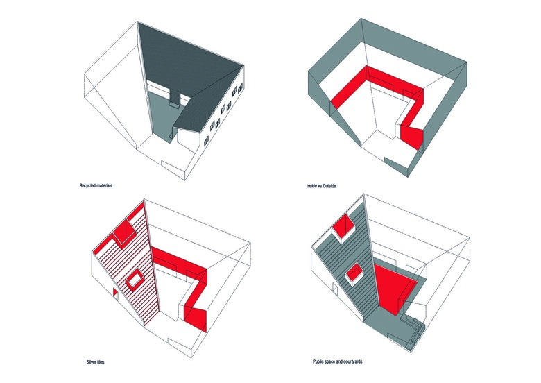 The new building defines the edge of the site as a U-section with one side of the courtyard left open. The roof plane is a continuous ribbon that rises from the ground as a series of steps forming a new public space and outdoor classroom that then becomes roof, before dropping down again to form a ground plane that defines the edge of the courtyard. The steps are punctuated with small micro-courtyards which continue into the library which has its own internal courtyard. The roof is clad in old, recycled tiles collected from numerous villages in the local area as old buildings are replaced with new concrete and tiled houses. At three moments the roof tiles become vertical walls which direct water off the roof into the ground. This perforated screen walI will encourage climbing plants cooling the air in the hot summer months. In contrast to this rough-tile, smooth, mirror-tiles are deployed on the courtyard façade and on the vertical faces of the steps. This creates visual mirages and distorted reflections that are animated as the children play in the courtyard and on the steps during break time. As the village evolves and grows it is hoped that through the provision of this open public space and library that the school can become a community focal point and open to all.