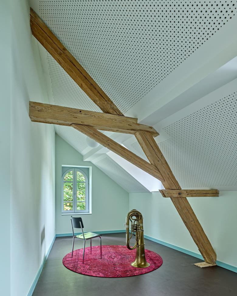 Innen setzt sich die starke Geometrie fort, woraus sich teils frappierende Details ergeben: Die Räume im Obergeschoss erreicht man über eine skulptural inszenierte Treppe. Dreh- und Angelpunkt ist ein zentraler Raum, um den sich das Unterrichtsleben kaleidoskopisch dreht. Trotz gewisser Dramatik wirken die sechs Kabinette intim – ihre Dachschrägen und schiefzulaufenden Wände sind der Akustikverbesserung geschuldet und haben etwas Beschützendes. Herzstück der einstigen Kapelle bleibt der von Bausünden befreite Musiksaal im Erdgeschoss, wo rekonstruierte Rundbogenfenster, neue Deckengewölbe, Holztäfer sowie raumhohe Vorhänge eine wohnlich-heitere Atmosphäre versprühen. (mc)
