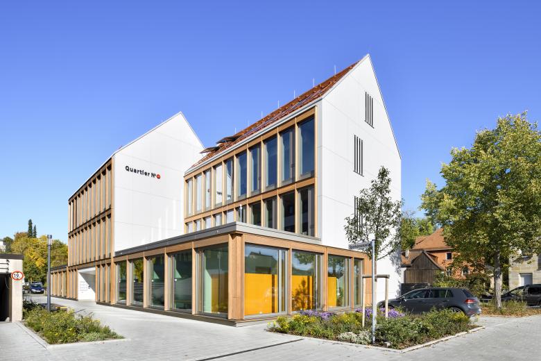 Östlich der bestehenden Geschäftsstelle der Sparkasse Nürnberg in der Saarstraße in Lauf an der Pegnitz besitzt die Sparkasse Nürnberg eine unbebaute Fläche von rund 1.330 Quadratmetern, die aus mehreren Teilflurstücken besteht und als Parkplatz genutzt wurde. An diesem Standort sollte die städtebauliche Lücke geschlossen werden und ein zeitgemäßes, energieeffizientes Dienstleistungsgebäude entstehen. Die Nutzungsausrichtung zielte auf flexible Büroflächen, die vielfältig und mit unterschiedlichen Bürokonzepten genutzt werden können. Die Mietflächenteilung wurde auf Einheiten zwischen 100 und 300 Quadratmetern ausgelegt. Die erforderlichen Stellplätze wurden in einer Tiefgarage nachgewiesen. Das Grundstück befindet sich im denkmalgeschützten Ensemble der Altstadt von Lauf an der Pegnitz. Der Neubau wurde mit drei Vollgeschossen und einem Dachgeschoss geplant und in Hybridbauweise aus Stahlbeton und Holzmassivbauteilen (BBS) errichtet. Die Fassaden wurden als Holz-Aluminium Konstruktionen ausgeführt. Die Giebelseiten erhielten eine hinterlüftete Fassadenverkleidung aus Faserbeton. Durch Planung und Ausführungsqualitäten wurde eine Zertifizierung nach DGNB Gold erreicht. Die daraus resultierenden Anforderungen an haustechnische Anlagen (Nutzung regenerativer Energieformen, Kühlung der Mietflächen über bauteilaktivierte Stahlbetondecken, Luft-Wasserwärmepumpe, Photovoltaik etc.) wurden umgesetzt.