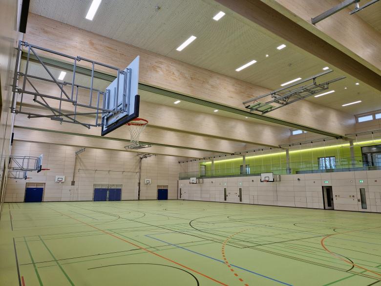 Die Sporthalle wurde als kompakter Baukörper konzipiert und ist im Volumen differenziert. Der höhere Hallenbereich wird an den Längsseiten durch niedrigere Baukörper ergänzt: