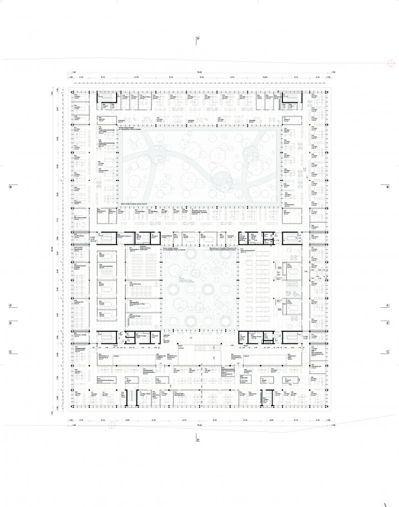 Der Name vom Projekt «Einer für Alle» erläutert im Grundprinzip bereits den Erschliessungsgedanken des Gebäudes. Die offene und übersichtliche Erschliessung im 2. OG verbindet sämtliche Nutzungen über die vertikalen Kerne und lässt so einen maximalen Spielraum für die Verteilung der Büro’s und Abteilungen zu. Alle Funktionen auf den verschiedenen Geschossen sind über die vertikalen Kerne über kurze Distanzen gut erschlossen.