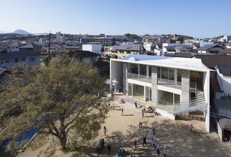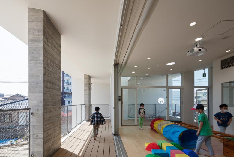 In recent years, child welfare facilities have often become more closed off due to concerns about serious accidents involving children, measures against suspicious individuals, and noise control to prevent becoming a nuisance to neighbors. This kindergarten building strives to create a space where children in various situations can move freely and safely. It achieves this by providing a well-protected environment while integrating interior and exterior spaces for openness. It also realizes a multi-level spatial layout within the limited residential lot, enabling the creation of separate building sections.