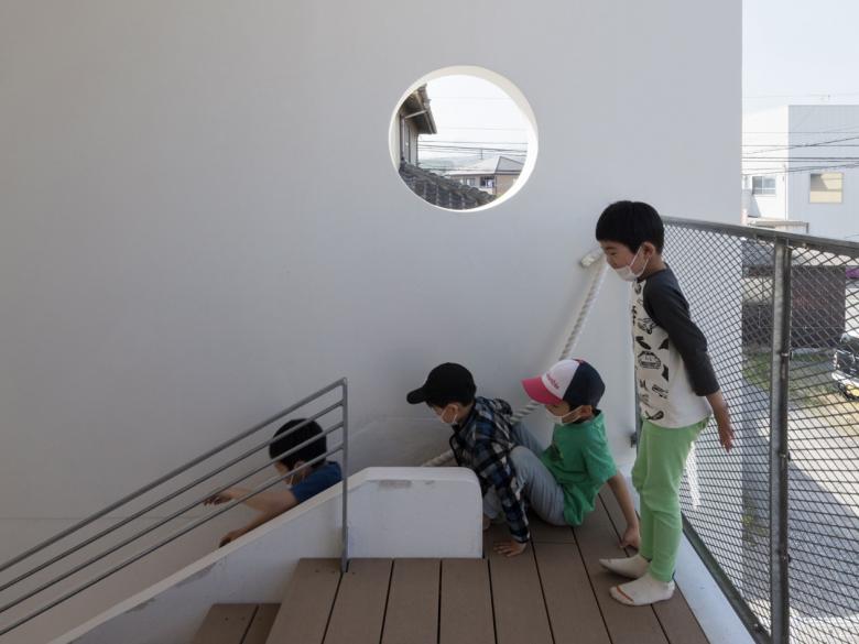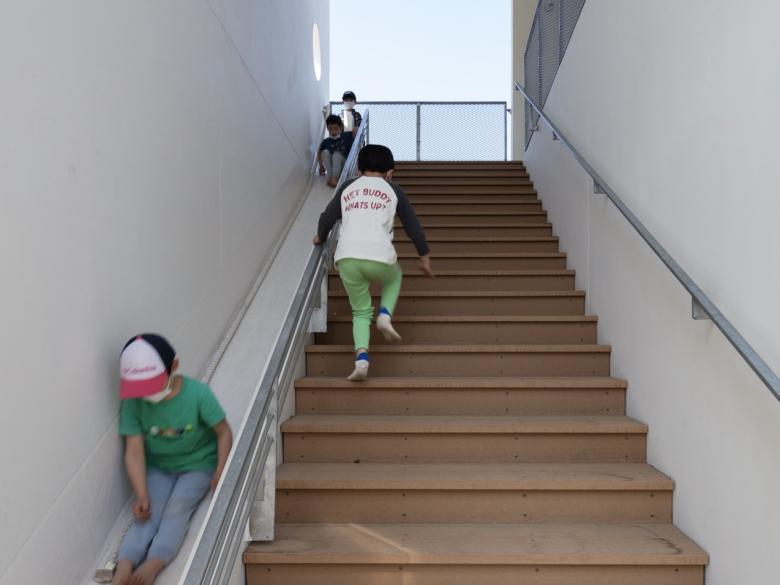 It maintains a spatial connection with the existing kindergarten building via a shared plaza. Children aged two and above, as well as local children using the second floor, may visit. A semi-outdoor space connects the east and west wings vertically. The west side features stairs and a slide. The east side has stairs connecting the upper and lower terraces, along with three-dimensional nets and climbing holds. The aim was to create a kindergarten building that functions as play equipment, enabling children to move around, play, and interact in a multi-dimensional space.
