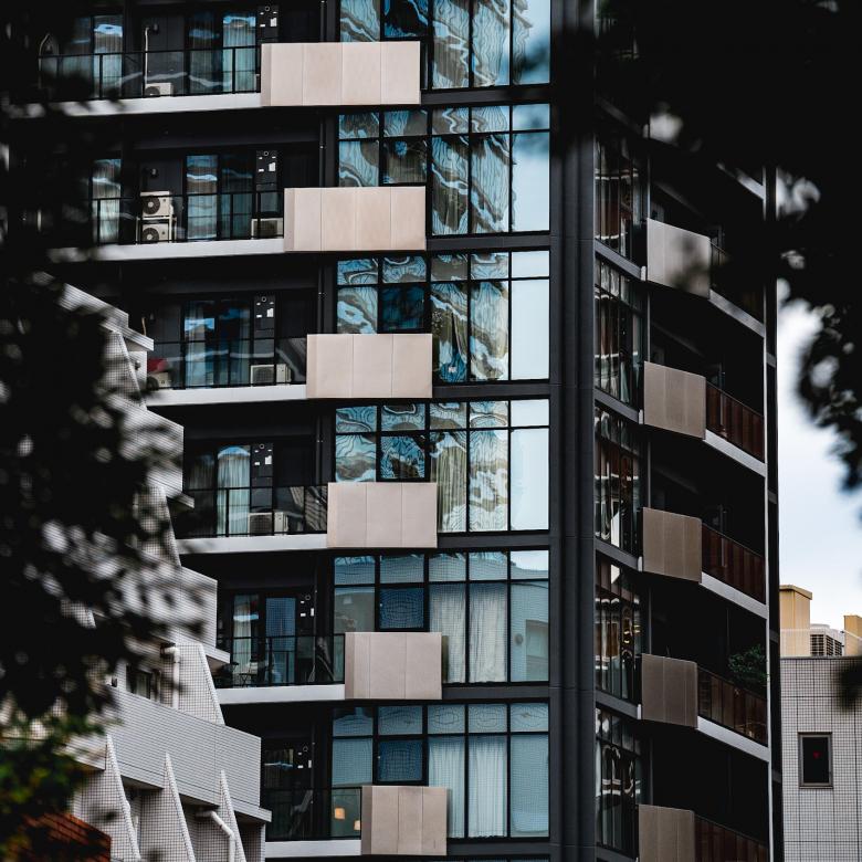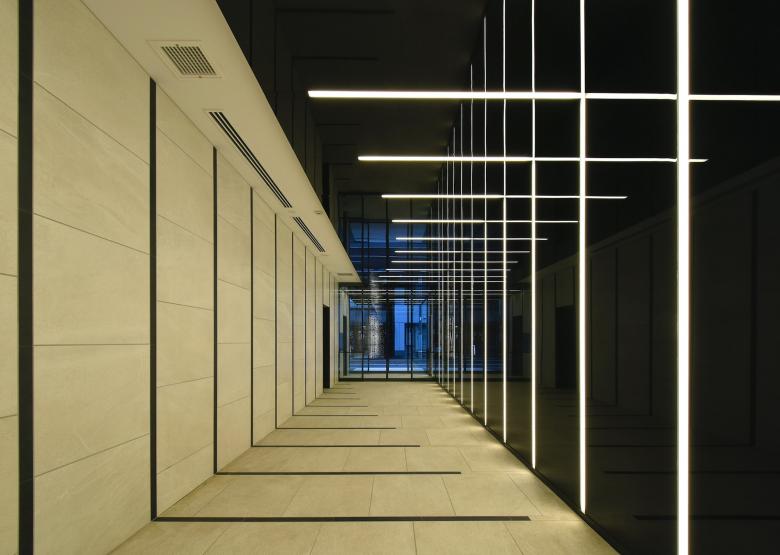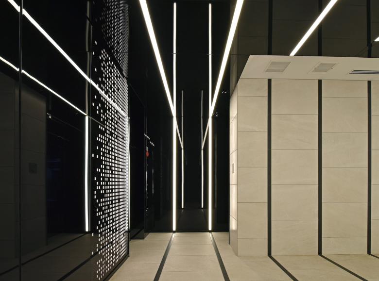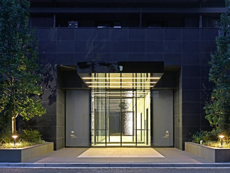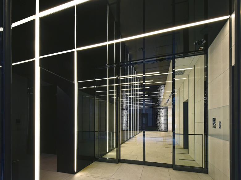 The entrance design with an other-worldly transition switching on and off the body and soul. The narrow tunnel-shaped entrance hallway creates a fantastic visual rhythm filtering people from the exterior eaves out front through zones of light running deeper into the entrance. The visually stunning presentation of light and shadow is made possible by dividing and varying the angle of materials throughout the space. To welcome active people living an urban life, the entrance has a wall of light located at the back of this tunnel which conveys images of glistening water.