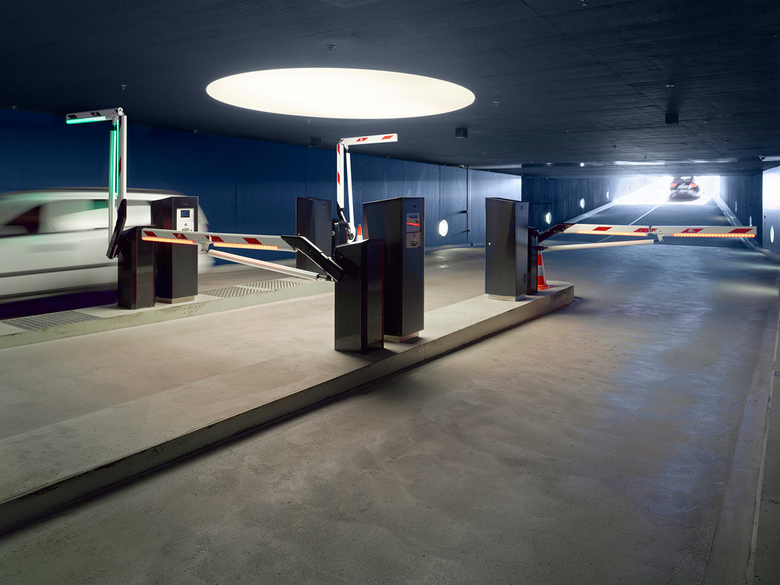 Die Rationalität der unterirdischen Parkierungsanlage wird mit gezielten gestalterischen Auszeichnungen aufgewertet: Die Zufahrt von der Falkenstrasse wird als festlicher Auftakt, als geheimnisvolles Eintauchen hinunter in die offenen und übersichtlichen Hallen inszeniert. Die mitternachtsblauen Schallschutzwände werden zum festlichen Vorhang.