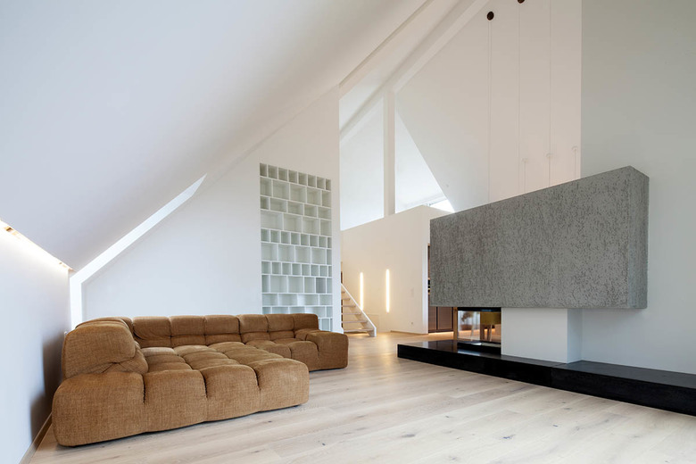 A massive open fireplace is the almost archaic centre due to its reduced design as well as its concrete base and rough plasterwork.
