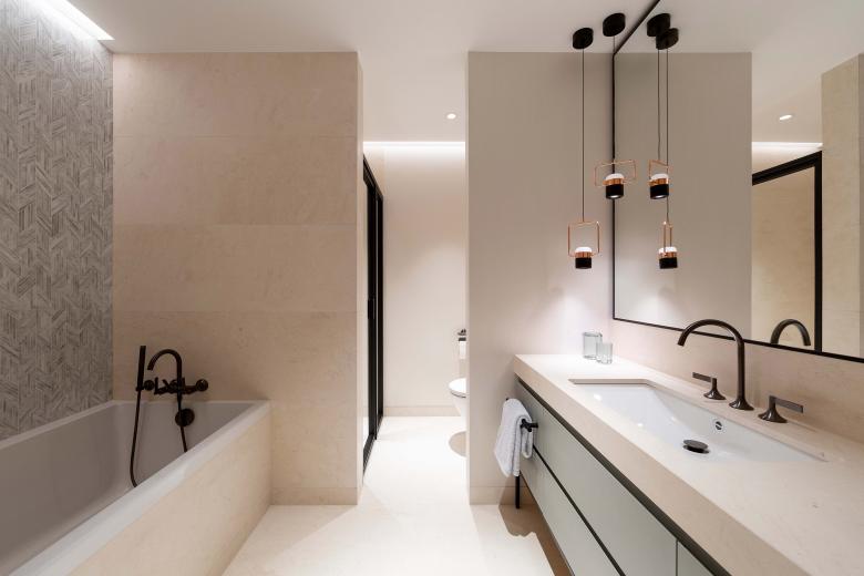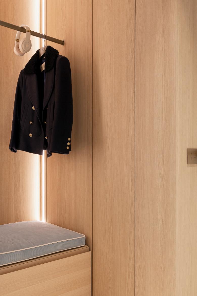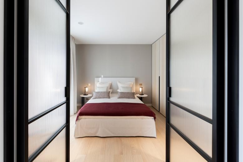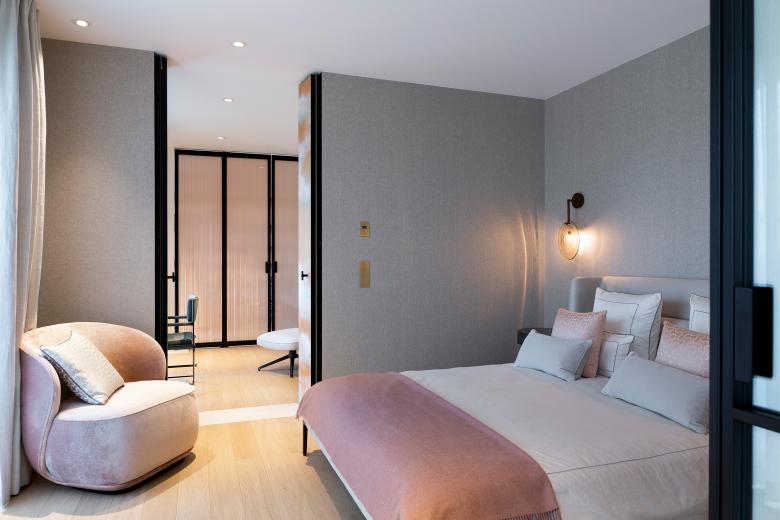 The floor-to-ceiling doors, which allow or prevent glimpses into the various rooms depending on their use, are striking. This was created through the choice of materials, which ranges from transparent glass, corrugated glass, metal mesh to hand-painted wallpaper. The tailor-made, built-in furniture and loose furniture, combined with modern designer pieces, are unique. The special feature is the built-in cabinets made of natural oak and covered with the finest linen. All of the wardrobes are specially designed to meet the needs of the client, so that every item of clothing finds its specific place, from coat to shoes to belt. The dressing room is rounded off by personalized clothes hangers. The light natural stone floor made of Crema d'Orcia limestone extends from the corridors into the bathrooms, where the harmonious world of colors continues on the walls, and individual accents are set by glass mosaics. Bronze-colored fittings enhance the wellness-like oases. Our scope of work comprised of all creative design elements, from the setting of the rooms to finding the last accessory. Finally, the precise lighting creates a mood that is equivalent to a 5-star suite. A luxury that is inconspicuous, but still fully noticeable.
