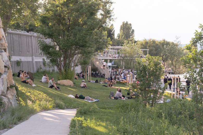 Green islands and suspended nets add further spatial qualities for the diverse needs of Danube visitors, complemented by public showers.