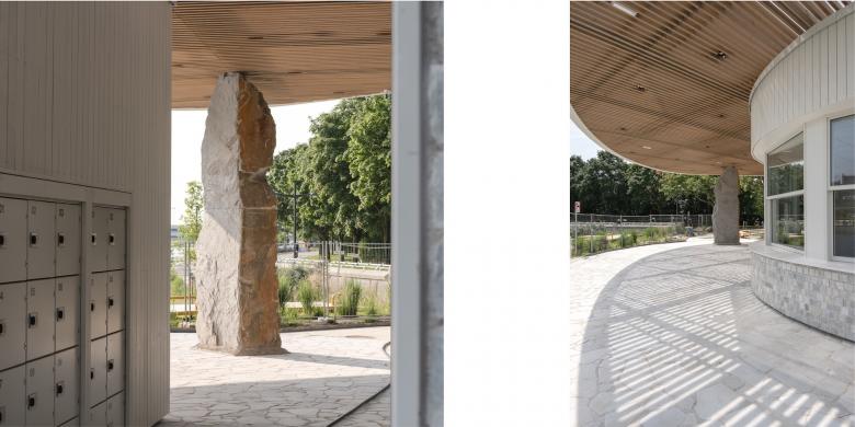 Downstream, the seasonal Outdoor Café — a solid brick building — marks the endpoint of the first construction phase. Its façade of Rauris natural stone continues across the terrace as polygonal stone slabs. A partially waterproof shading roof rests on a single large stone column, framing the terrace with views across the bathing landscape and the Danube. Public toilets, a drinking fountain and lockers are directly connected, providing essential infrastructure.